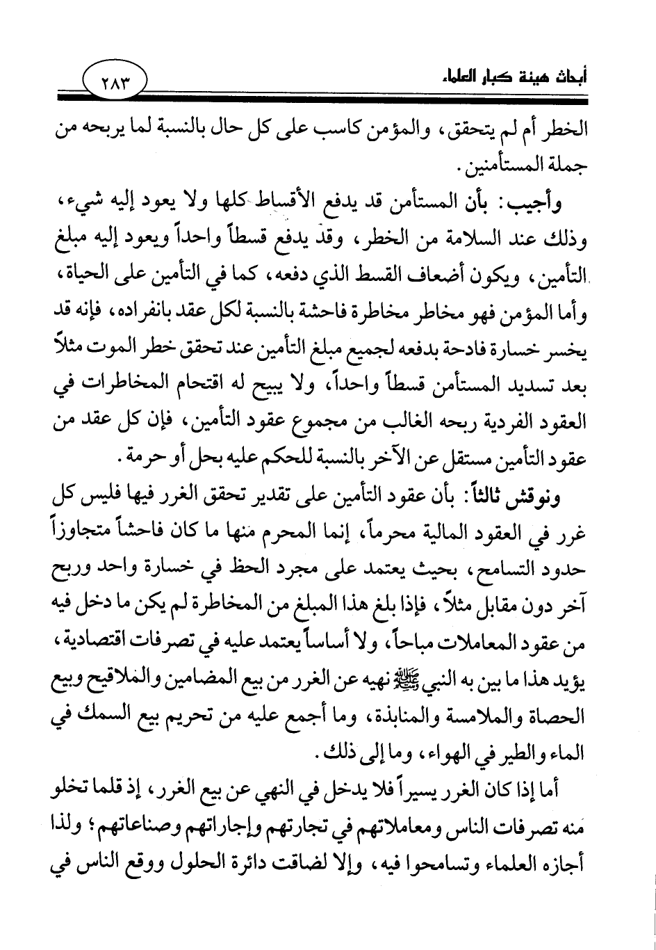 ونوقش ثالثا: بأن عقود التأمين على تقدير تحقق الغرر فيها فليس كل غرر في العقود المالية محرما، إنما المحرم منها ما كان فاحشا متجاوزا حدود التسامح، بحيث يعتمد على مجرد الحظ في خسارة واحد وربح آخر دون مقابل مثلا، فإذا بلغ هذا المبلغ من المخاطرة لم يكن ما دخل فيه من عقود المعاملات مباحا، ولا أساسا يعتمد عليه في تصرفات اقتصادية، يؤيد هذا ما بين به النبي صلى الله عليه وسلم نهيه عن الغرر من بيع المضامين والملاقيح وبيع الحصاة والملامسة والمنابذة، وما أجمع عليه من تحريم بيع السمك في الماء والطير في الهواء، وما إلى ذلك.