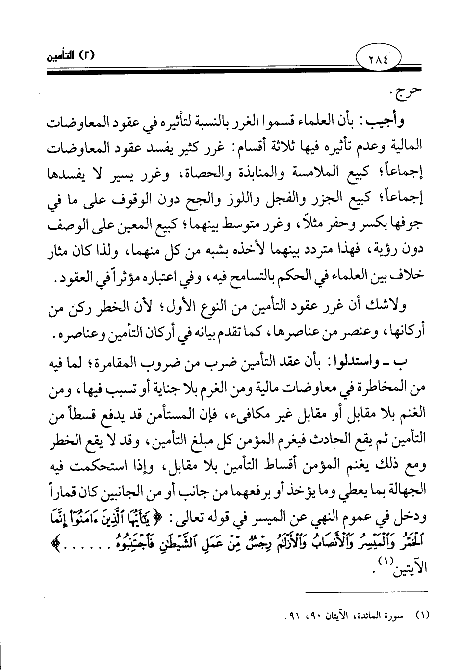 ب- واستدلوا: بأن عقد التأمين ضرب من ضروب المقامرة؛ لما فيه من المخاطرة في معاوضات مالية ومن الغرم بلا جناية أو تسبب فيها، ومن الغنم بلا مقابل أو مقابل غير مكافئ، فإن المستأمن قد يدفع قسطا من التأمين ثم يقع الحادث فيغرم المؤمن كل مبلغ التأمين، وقد لا يقع الخطر ومع ذلك يغنم المؤمن أقساط التأمين بلا مقابل، وإذا استحكمت فيه الجهالة بما يعطي وما يؤخذ أو برفعهما من جانب أو من الجانبين كان قمارا ودخل في عموم النهي عن الميسر في قوله تعالى: {يَا أَيُّهَا الَّذِينَ آمَنُوا إِنَّمَا الْخَمْرُ وَالْمَيْسِرُ وَالْأَنْصَابُ وَالْأَزْلَامُ رِجْسٌ مِنْ عَمَلِ الشَّيْطَانِ فَاجْتَنِبُوهُ} (¬1) الآيتين.