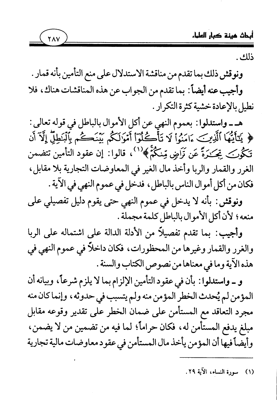 هـ- واستدلوا: بعموم النهي عن أكل الأموال بالباطل في قوله تعالى: {يَا أَيُّهَا الَّذِينَ آمَنُوا لا تَأْكُلُوا أَمْوَالَكُمْ بَيْنَكُمْ بِالْبَاطِلِ إِلَّا أَنْ تَكُونَ تِجَارَةً عَنْ تَرَاضٍ مِنْكُمْ} (¬1) قالوا: إن عقود التأمين تتضمن الغرر والقمار والربا وأخذ مال الغير في المعاوضات التجارية بلا مقابل، فكان من أكل أموال الناس بالباطل، فدخل في عموم النهي في الآية.