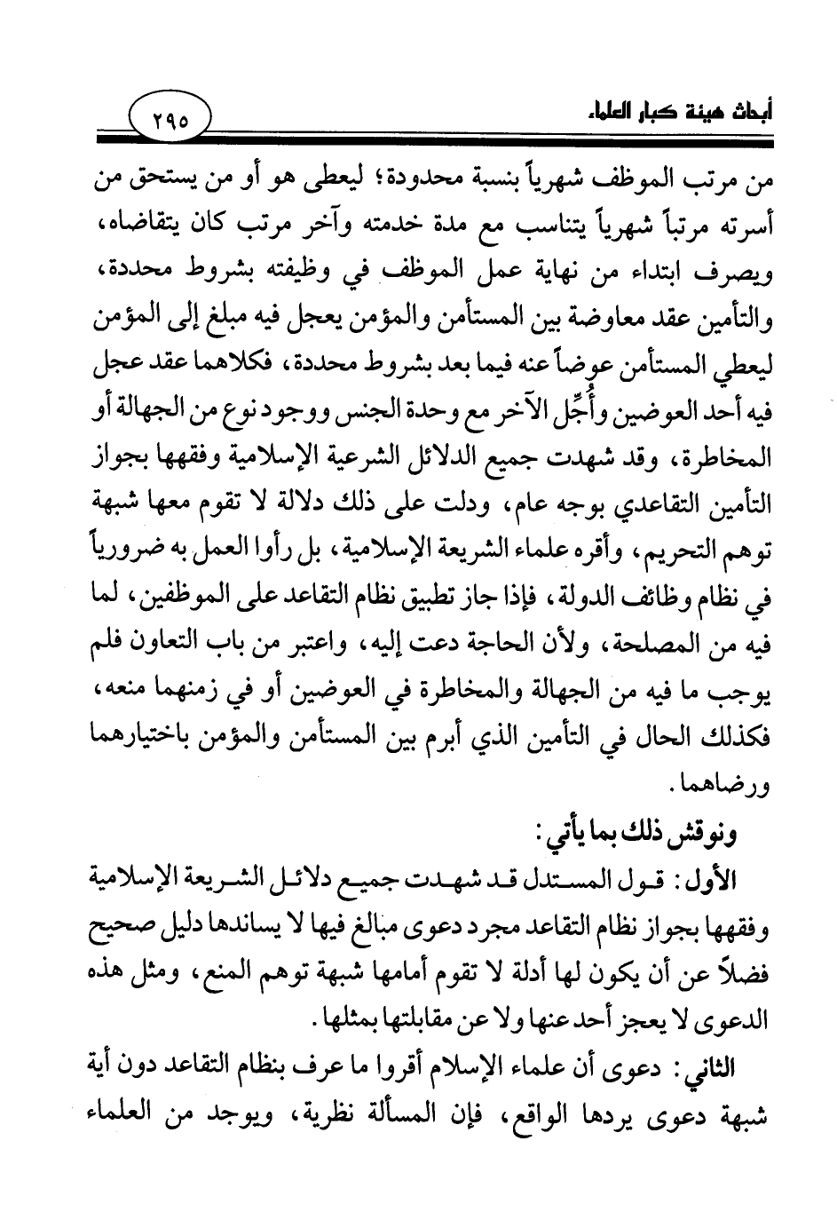 الثاني: دعوى أن علماء الإسلام أقروا ما عرف بنظام التقاعد دون أية شبهة دعوى يردها الواقع، فإن المسألة نظرية، ويوجد من العلماء