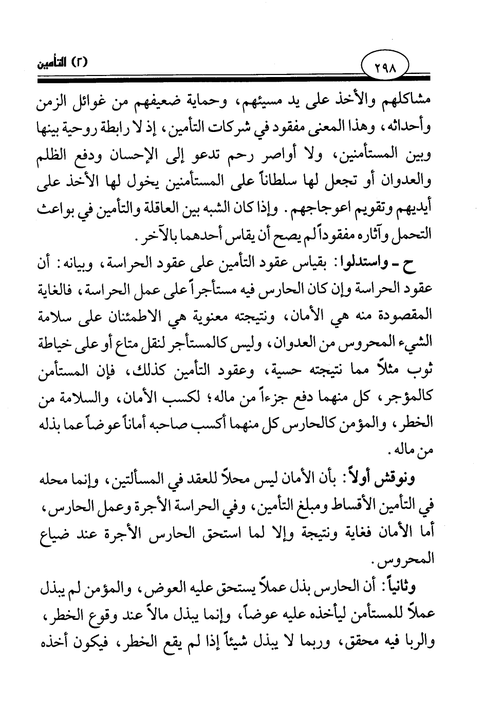 وثانيا: أن الحارس بذل عملا يستحق عليه العوض، والمؤمن لم يبذل عملا للمستأمن ليأخذه عليه عوضا، وإنما يبذل مالا عند وقوع الخطر، والربا فيه محقق، وربما لا يبذل شيئا إذا لم يقع الخطر، فيكون أخذه
