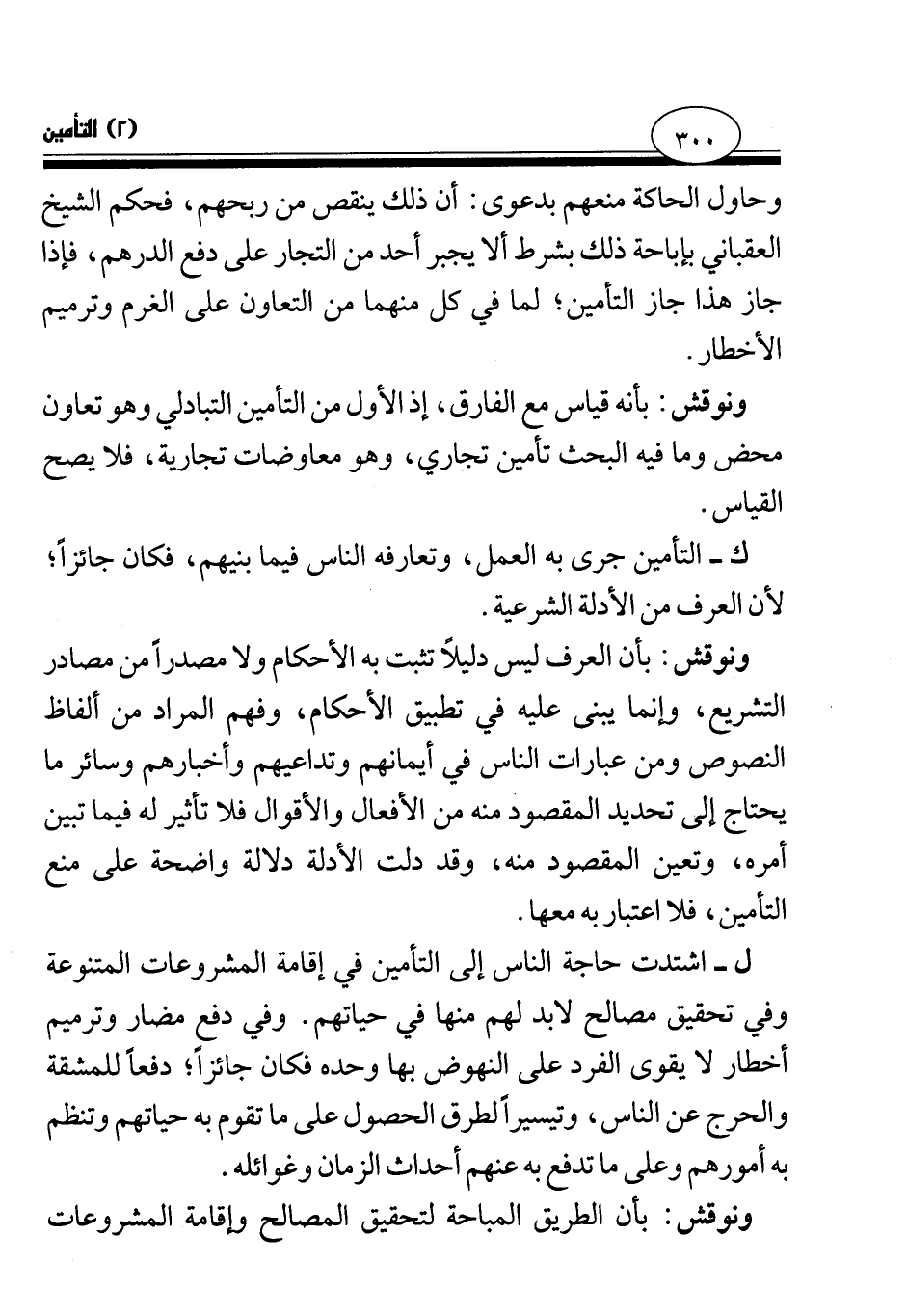ل- اشتدت حاجة الناس إلى التأمين في إقامة المشروعات المتنوعة وفي تحقيق مصالح لا بد لهم منها في حياتهم. وفي مضار وترميم أخطار لا يقوى الفرد على النهوض بها وحده فكان جائزا؛ دفعا للمشقة والحرج عن الناس، وتيسيرا لطرق الحصول على ما تقوم به حياتهم وتنظم به أمورهم وعلى ما تدفع به عنهم أحداث الزمان وغوائله.