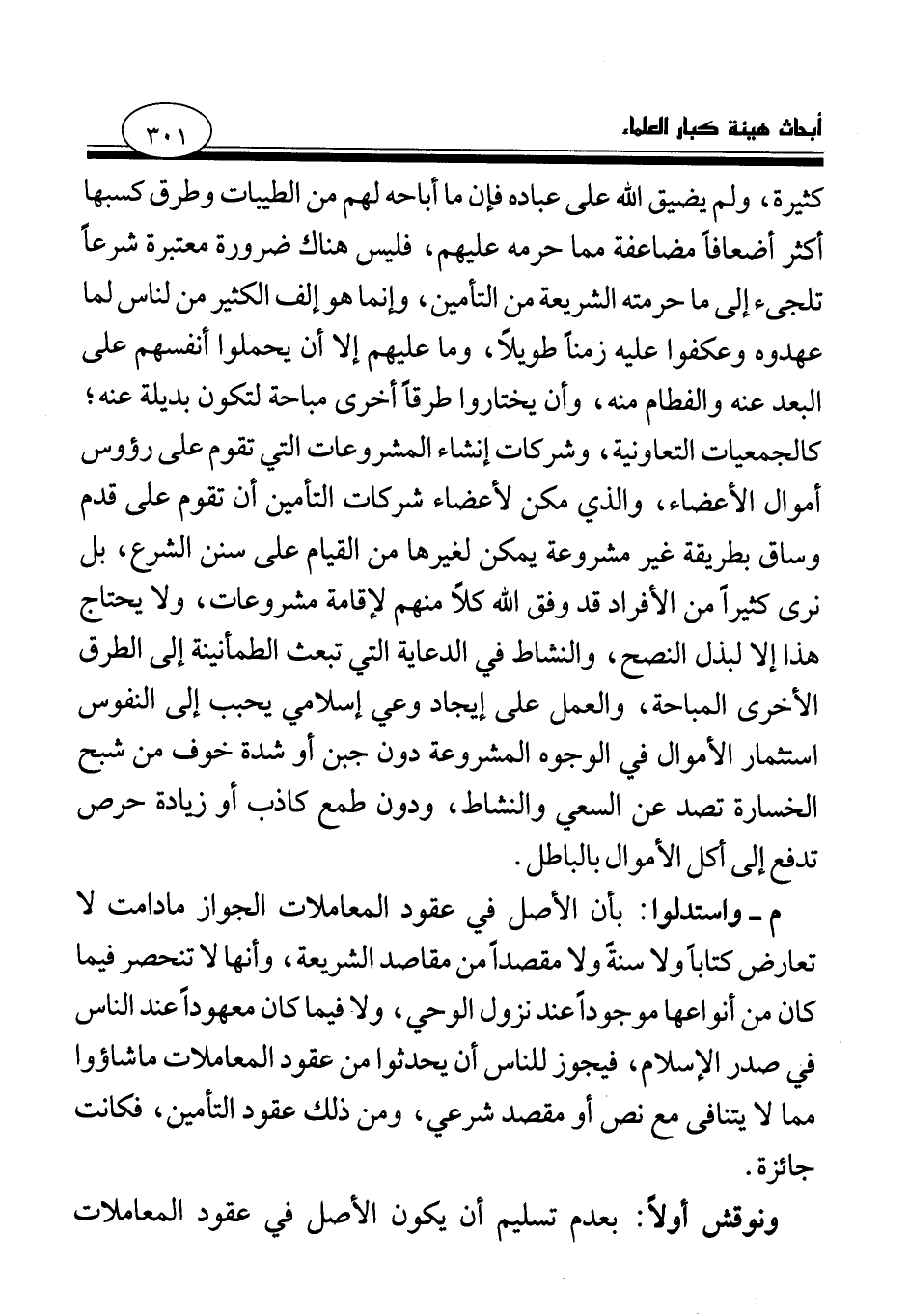 كثيرة، ولم يضيق الله على عباده فإن ما أباحه لهم من الطيبات وطرق كسبها أكثر أضعافا مضاعفة مما حرمه عليهم، فليس هناك ضرورة معتبرة شرعا تلجئ إلى ما حرمته الشريعة من التأمين، وإنما هو إلف الكثير من الناس لما عهدوه وعكفوا عليه زمنا طويلا، وما عليهم إلا أن يحملوا أنفسهم على البعد عنه؛ والفطام منه، وأن يختاروا طرقا أخرى مباحة لتكون بديلة عنه؛ كالجمعيات التعاونية، وشركات إنشاء المشروعات التي تقوم على رءوس أموال الأعضاء، والذي مكن لأعضاء شركات التأمين أن تقوم على قدم وساق بطريقة غير مشروعة يمكن لغيرها من القيام على سنن الشرع، بل نرى كثيرا من الأفراد قد وفق الله كلا منهم لإقامة مشروعات، ولا يحتاج إلا لبذل النصح، والنشاط في الدعاية التي تبعث الطمأنينة إلى الطرق الأخرى المباحة، والعمل على إيجاد وعي إسلامي يحبب إلى النفوس استثمار الأموال في الوجوه المشروعة دون جبن أو شدة خوف من شبح الخسارة تصد عن السعي والنشاط؛ ودون طمع كاذب أو زيادة حرص تدفع إلى أكل الأموال بالباطل.