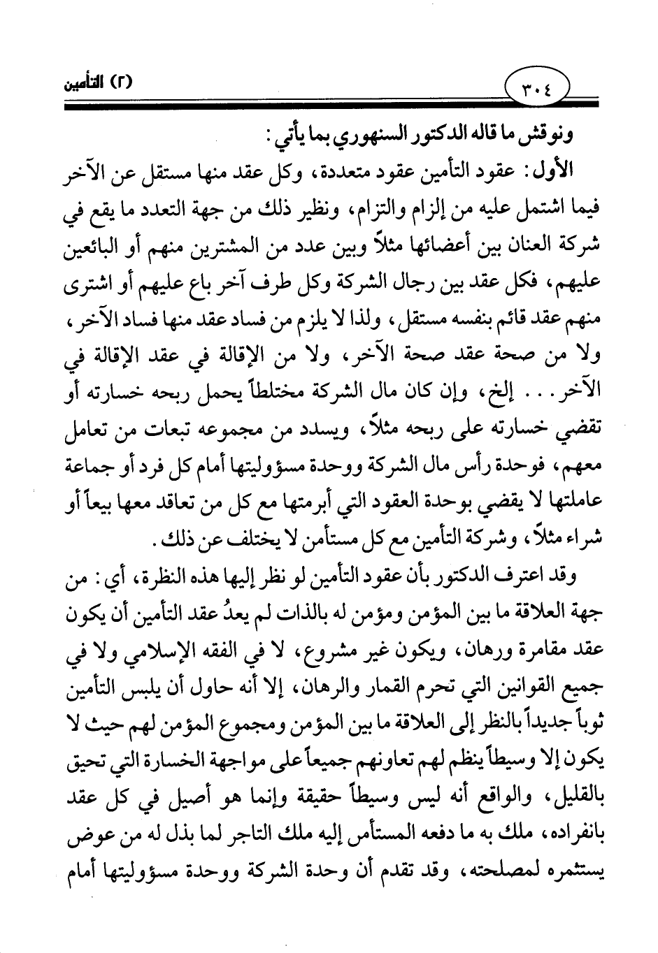 وقد اعترف الدكتور بأن عقود التأمين لو نظر إليها هذه النظرة، أي: من جهة العلاقة ما بين المؤمن ومؤمن له بالذات لم يعد عقد التأمين أن يكون عقد مقامرة ورهان، ويكون غير مشروع، لا في الفقه الإسلامي ولا في جميع القوانين التي تحرم القمار والرهان، إلا أنه حاول أن يلبس التأمين ثوبا جديدا بالنظر إلى العلاقة ما بين المؤمن ومجموع المؤمن لهم حيث لا يكون إلا وسيطا ينظم لهم تعاونهم جميعا على مواجهة الخسارة التي تحيق بالقليل، والواقع أنه ليس وسيطا حقيقة وإنما هو أصيل في كل عقد بانفراده، ملك به ما دفعه المستأمن إليه ملك التاجر لما بذل له من عوض يستثمره لمصلحته، وقد تقدم أن وحدة الشركة ووحدة مسئوليتها أمام