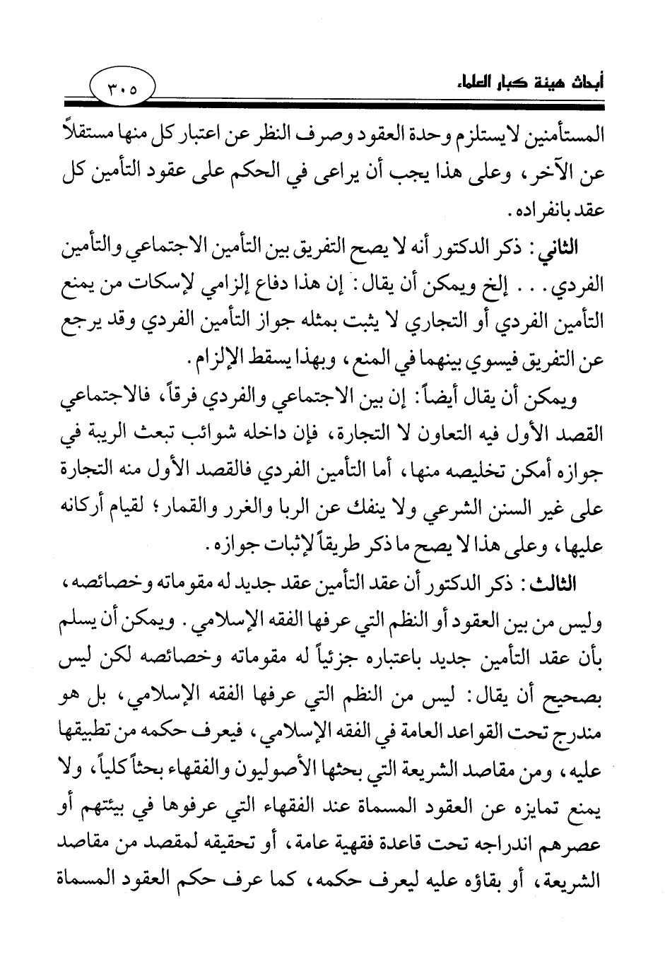 الثالث: ذكر الدكتور أن عقد التأمين عقد جديد له مقوماته وخصائصه، وليس من بين العقود أو النظم التي عرفها الفقه الإسلامي. ويمكن أن يسلم بأن عقد التأمين جديد باعتباره جزئيا له مقوماته وخصائصه لكن ليس بصحيح أن يقال: ليس من النظم التي عرفها الفقه الإسلامي، بل هو مندرج تحت القواعد العامة في الفقه الإسلامي، فيعرف حكمه من تطبيقها عليه ومن مقاصد الشريعة التي بحثها الأصوليون والفقهاء بحثا كليا، ولا يمنع تمايزه عن العقود المسماة عند الفقهاء التي عرفوها في بيئتهم أو عصرهم اندراجه تحت قاعدة فقهية عامة، أو تحقيقه لمقصد من مقاصد الشريعة، أو بقاؤه عليه ليعرف حكمه، كما عرف حكم العقود المسماة