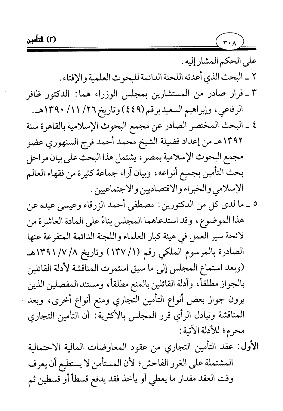 5 - ما لدى كل من الدكتورين: مصطفى أحمد الزرقاء وعيسى عبده عن هذا الموضوع، وقد استدعاهما المجلس بناء على المادة العاشرة من لائحة سير العمل في هيئة كبار العلماء واللجنة الدائمة المتفرعة عنها الصادرة بالمرسوم الملكي رقم (1\ 137) وتاريخ 8\ 7\1391 هـ (وبعد استماع المجلس إلى ما سبق استمرت المناقشة لأدلة القائلين بالجواز مطلقا، وأدلة القائلين بالمنع مطلقا، ومستند المفصلين الذين يرون جواز بعض أنواع التأمين التجاري ومنع أنواع أخرى، وبعد المناقشة وتبادل الرأي قرر المجلس بالأكثرية: أن التأمين التجاري محرم؛ للأدلة الآتية: