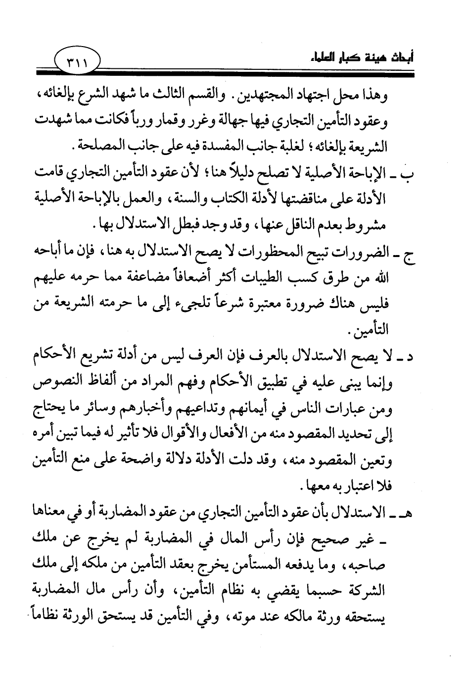 د- لا يصح الاستدلال بالعرف فإن العرف ليس من أدلة تشريع الأحكام وإنما يبنى عليه في تطبيق الأحكام وفهم المراد من ألفاظ النصوص ومن عبارات الناس في أيمانهم وتداعيهم وأخبارهم وسائر ما يحتاج إلى تحديد المقصود منه من الأفعال والأقوال فلا تأثير له فيما تبين أمره وتعين المقصود منه، وقد دلت الأدلة دلالة واضحة على منع التأمين فلا اعتبار به معها.