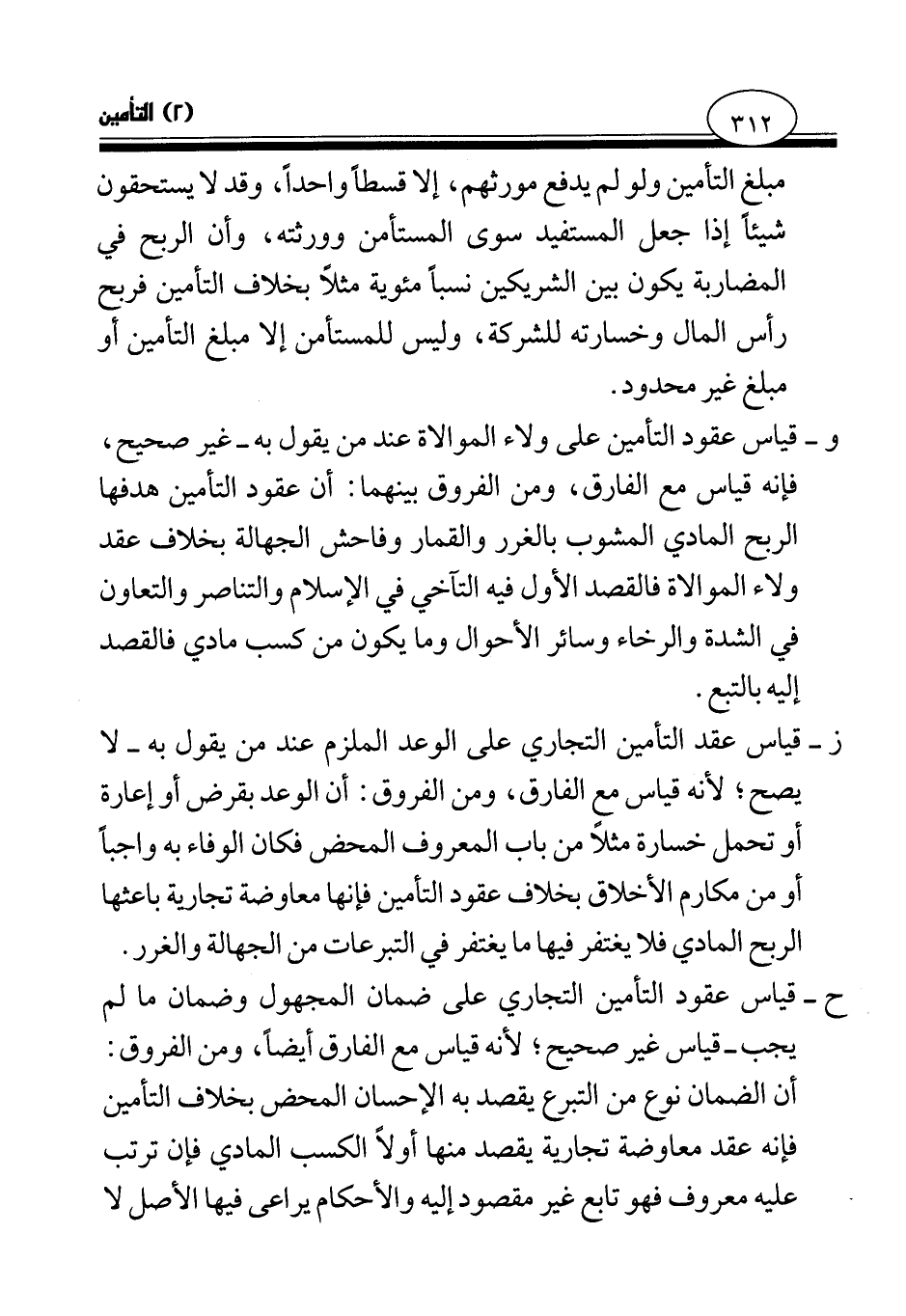 ح- قياس عقود التأمين التجاري على ضمان المجهول وضمان ما لم يجب - قياس غير صحيح؛ لأنه قياس مع الفارق أيضا، ومن الفروق: أن الضمان نوع من التبرع يقصد به الإحسان المحض بخلاف التأمين فإنه عقد معاوضة تجارية يقصد منها أولا الكسب المادي فإن ترتب عليه معروف فهو تابع غير مقصود إليه والأحكام يراعى فيها الأصل لا