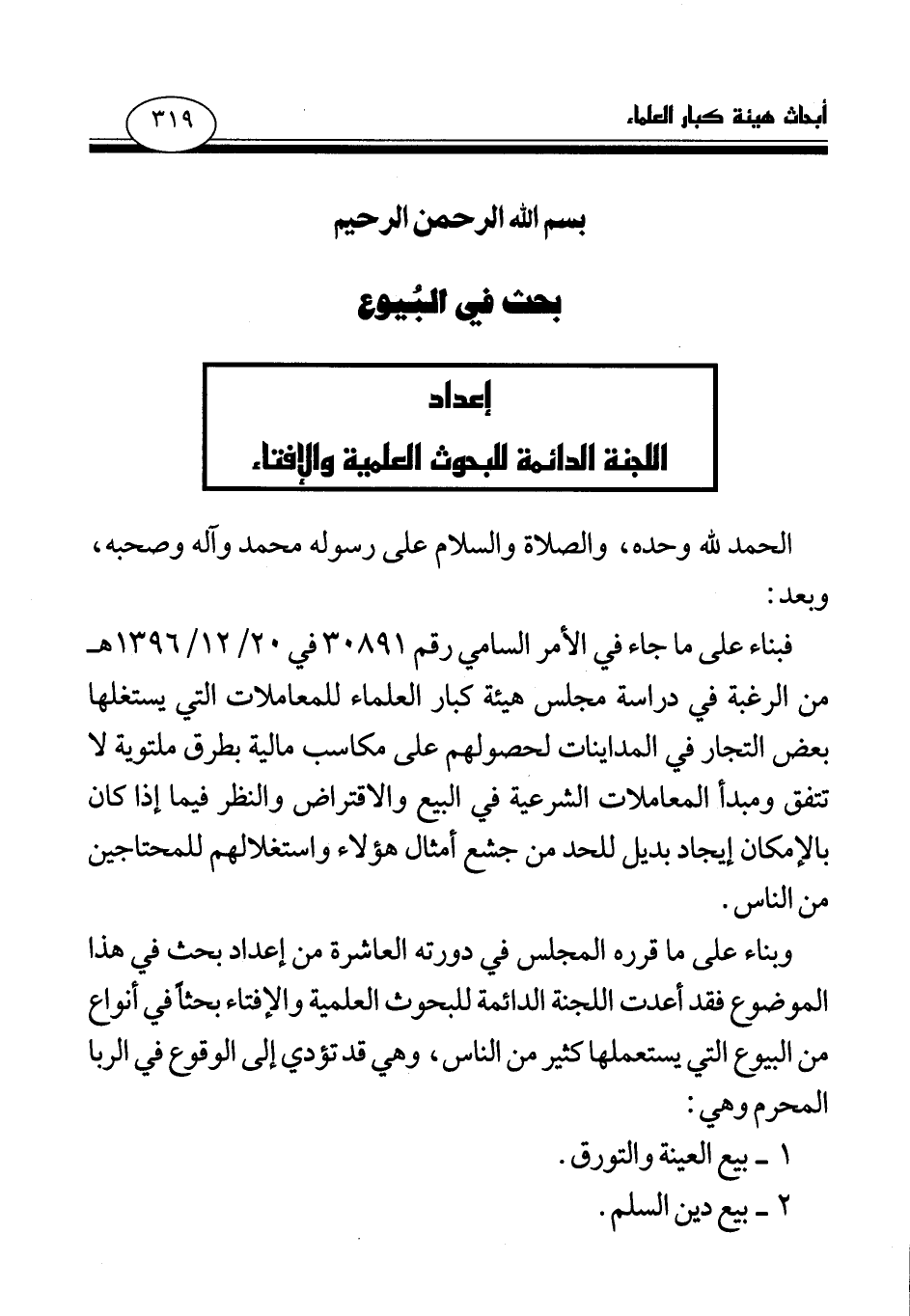 وبناء على ما قرره المجلس في دورته العاشرة من إعداد بحث في هذا الموضوع فقد أعدت اللجنة الدائمة للبحوث العلمية والإفتاء بحثا في أنواع من البيوع التي يستعملها كثير من الناس، وهي قد تؤدي إلى الوقوع في الربا المحرم وهي: