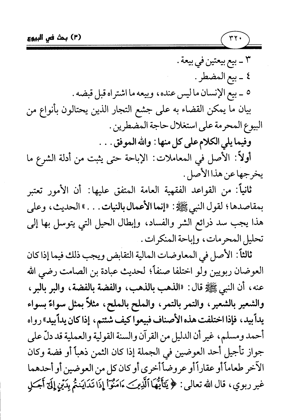 ثالثا: الأصل في المعاوضات المالية التقابض ويجب ذلك فيما إذا كان العوضان ربويين ولو اختلفا صنفا؛ لحديث عبادة بن الصامت رضي الله عنه، أن النبي صلى الله عليه وسلم قال: «الذهب بالذهب، والفضة بالفضة، والبر بالبر، والشعير بالشعير، والتمر بالتمر، والملح بالملح، مثلا بمثل سواء بسواء يدا بيد، فإذا اختلفت هذه الأصناف فبيعوا كيف شئتم، إذا كان يدا بيد (¬2) » رواه أحمد ومسلم، غير أن الدليل من القرآن والسنة القولية والعملية قد دل على جواز تأجيل أحد العوضين في الجملة إذا كان الثمن ذهبا أو فضة وكان الآخر طعاما أو عقارا أو عروضا أخرى أو كان كل من العوضين أو أحدهما غير ربوي، قال الله تعالى: {يَا أَيُّهَا الَّذِينَ آمَنُوا إِذَا تَدَايَنْتُمْ بِدَيْنٍ إِلَى أَجَلٍ مُسَمًّى فَاكْتُبُوهُ} (¬3)
