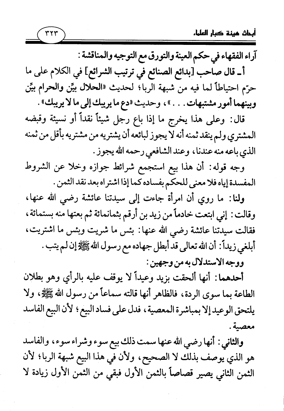 أ - قال صاحب [بدائع الصنائع في ترتيب الشرائع] في الكلام على ما حرم احتياطا لما فيه من شبهة الربا؛ لحديث: «الحلال بين والحرام بين وبينهما أمور مشتبهات (¬1) » . . .، وحديث: «دع ما يريبك إلى ما لا يريبك (¬2) » . قال: وعلى هذا يخرج ما إذا باع رجل شيئا نقدا أو نسيئة وقبضه المشتري ولم ينقد ثمنه أنه لا يجوز لبائعه أن يشتريه من مشتريه بأقل من ثمنه الذي باعه منه عندنا، وعند الشافعي رحمه الله يجوز.