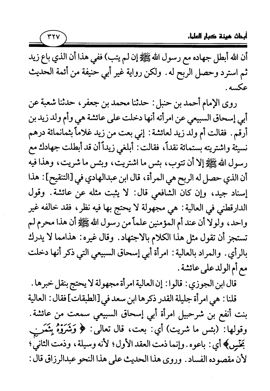 روى الإمام أحمد بن حنبل: حدثنا محمد بن جعفر، حدثنا شعبة عن أبي إسحاق السبيعي عن امرأته أنها دخلت على عائشة هي وأم ولد زيد بن أرقم. فقالت أم ولد زيد لعائشة: إني بعت من زيد غلاما بثمانمائة درهم نسيئة واشتريته بستمائة نقدا، فقالت: أبلغي زيدا أن قد أبطلت جهادك مع رسول الله صلى الله عليه وسلم إلا أن تتوب، بئس ما اشتريت، وبئس ما شريت، وهذا فيه أن الذي حصل له الربح هي المرأة، قال ابن عبد الهادي في [التنقيح] : هذا إسناد جيد، وإن كان الشافعي قال: لا يثبت مثله عن عائشة، وقول الدارقطني في العالية: - هي مجهولة لا يحتج بها - فيه نظر، فقد خالفه غير واحد، ولولا أن عند أم المؤمنين علما من رسول الله صلى الله عليه وسلم أن هذا محرم لم تستجز أن تقول مثل هذا الكلام بالاجتهاد. وقال غيره: هذا مما لا يدرك بالرأي. والمراد بالعالية: امرأة أبي إسحاق السبيعي التي ذكر أنها دخلت مع أم الولد على عائشة.
