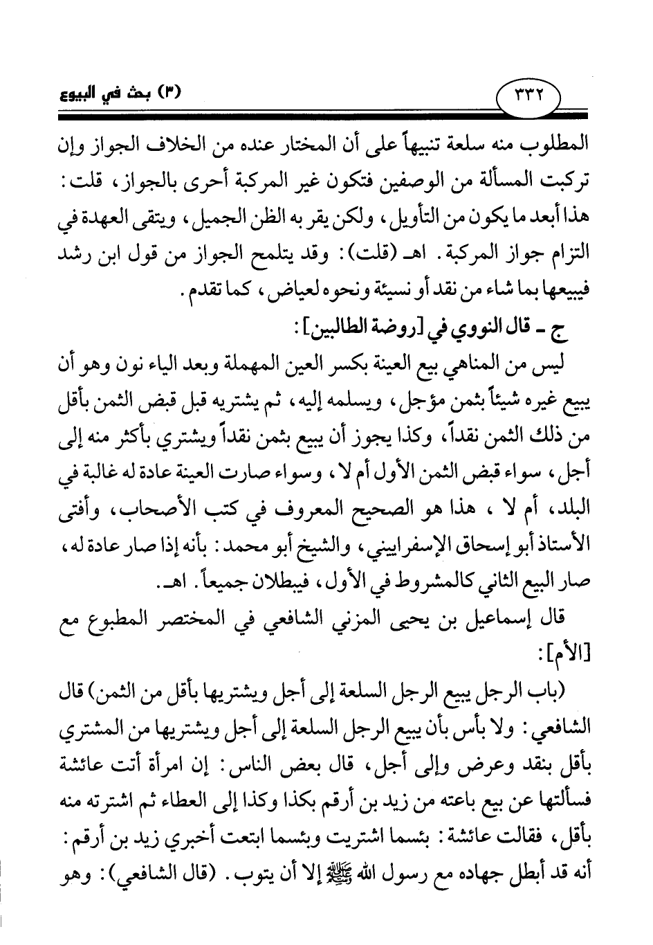 ليس من المناهي بيع العينة بكسر العين المهملة وبعد الياء نون وهو أن يبيع غيره شيئا بثمن مؤجل، ويسلمه إليه، ثم يشتريه قبل قبض الثمن بأقل من ذلك الثمن نقدا، وكذا يجوز أن يبيع بثمن نقدا ويشتري بأكثر منه إلى أجل، سواء قبض الثمن الأول أم لا، وسواء صارت العينة عادة له غالبة في البلد، أم لا، هذا هو الصحيح المعروف في كتب الأصحاب، وأفتى الأستاذ أبو إسحاق الإسفراييني، والشيخ أبو محمد: بأنه إذا صار عادة له، صار البيع الثاني كالمشروط في الأول، فيبطلان جميعا. اهـ.