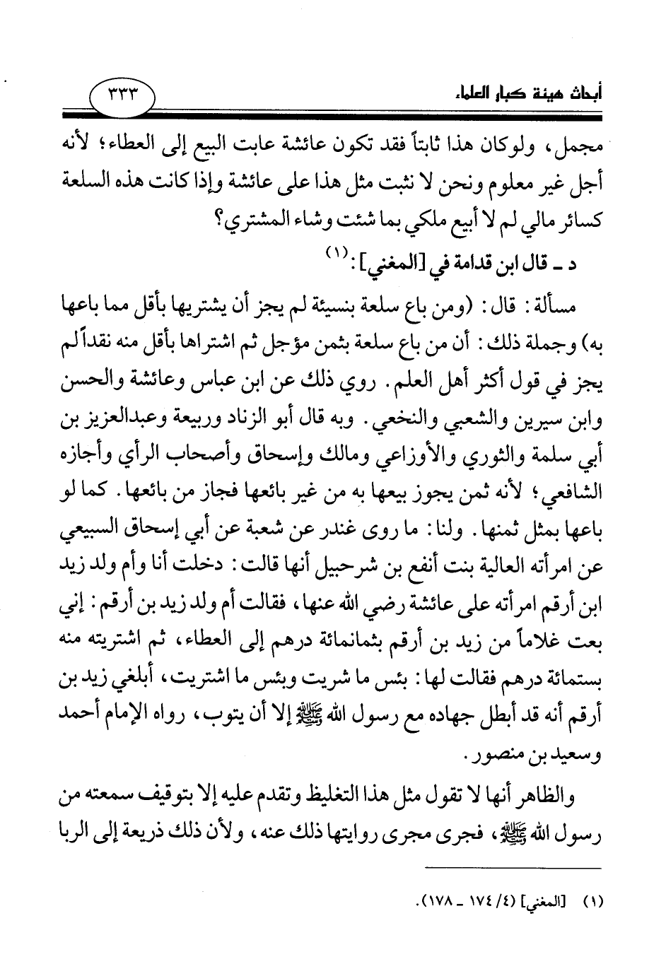 مسألة: قال: (ومن باع سلعة بنسيئة لم يجز أن يشتريها بأقل مما باعها به) وجملة ذلك: أن من باع سلعة بثمن مؤجل ثم اشتراها بأقل منه نقدا لم يجز في قول أكثر أهل العلم. روي ذلك عن ابن عباس وعائشة والحسن وابن سيرين والشعبي والنخعي. وبه قال أبو الزناد وربيعة وعبد العزيز بن أبي سلمة والثوري والأوزاعي ومالك وإسحاق وأصحاب الرأي وأجازه الشافعي؛ لأنه ثمن يجوز بيعها به من غير بائعها فجاز من بائعها. كما لو باعها بمثل ثمنها. ولنا: ما روى غندر عن شعبة عن أبي إسحاق السبيعي عن امرأته العالية بنت أنفع بن شرحبيل أنها قالت: دخلت أنا وأم ولد زيد بن أرقم امرأته على عائشة رضي الله عنها، فقالت أم ولد زيد بن أرقم: إني بعت غلاما من زيد بن أرقم بثمانمائة درهم إلى العطاء، ثم اشتريته منه بستمائة درهم فقالت لها: بئس ما شريت وبئس ما اشتريت، أبلغي زيد بن أرقم أنه قد أبطل جهاده مع رسول الله صلى الله عليه وسلم إلا أن يتوب، رواه الإمام أحمد وسعيد بن منصور.