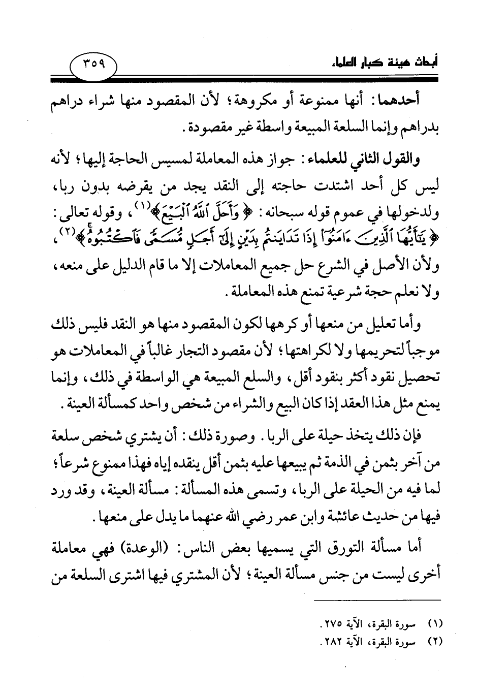 والقول الثاني للعلماء: جواز هذه المعاملة لمسيس الحاجة إليها؛ لأنه ليس كل أحد اشتدت حاجته إلى النقد يجد من يقرضه بدون ربا، ولدخولها في عموم قوله سبحانه: {وَأَحَلَّ اللَّهُ الْبَيْعَ} (¬1) وقوله تعالى: {يَا أَيُّهَا الَّذِينَ آمَنُوا إِذَا تَدَايَنْتُمْ بِدَيْنٍ إِلَى أَجَلٍ مُسَمًّى فَاكْتُبُوهُ} (¬2) ولأن الأصل في الشرع حل جميع المعاملات إلا ما قام الدليل على منعه، ولا نعلم حجة شرعية تمنع هذه المعاملة.