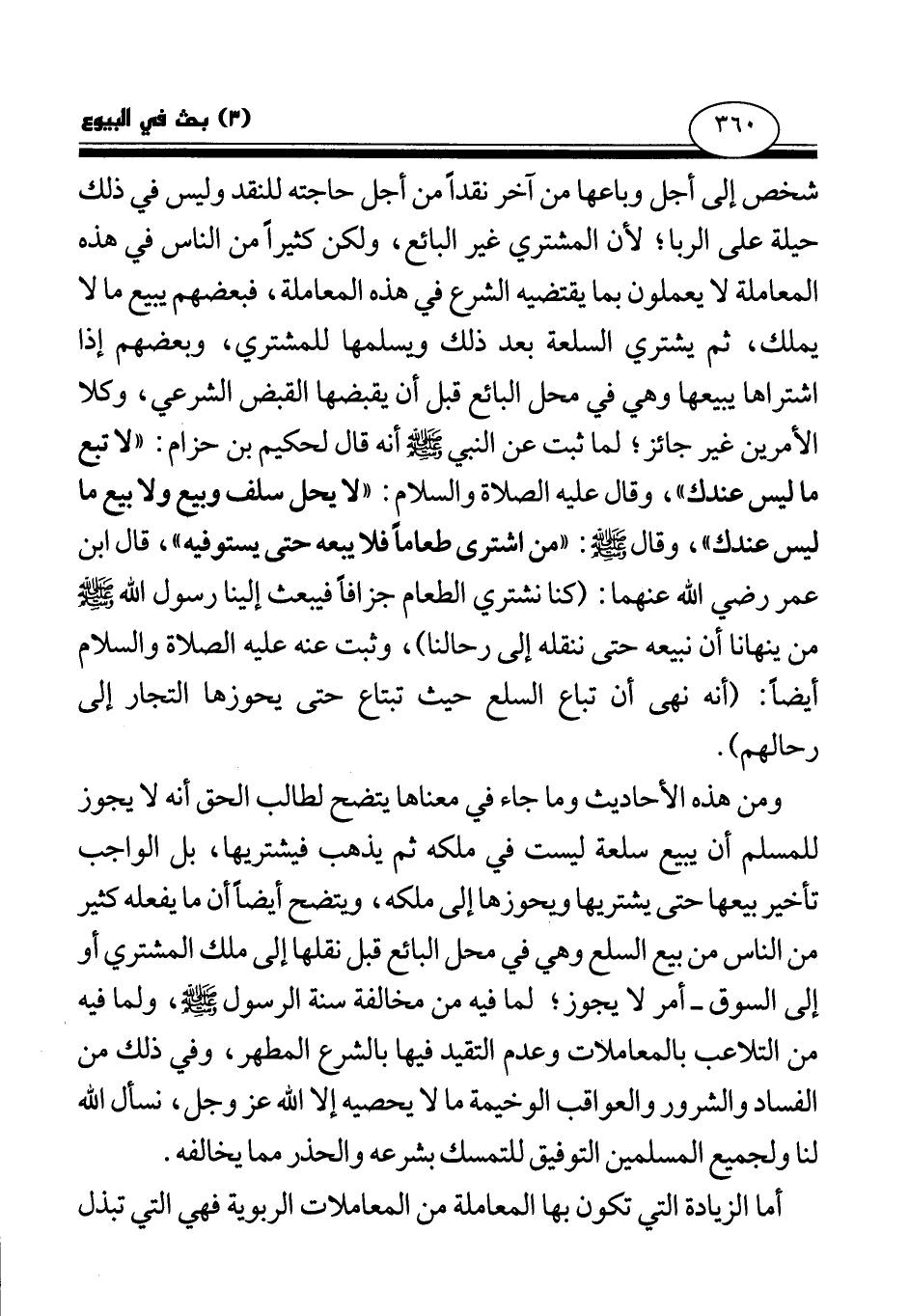 شخص إلى أجل وباعها من آخر نقدا من أجل حاجته للنقد وليس في ذلك حيلة على الربا؛ لأن المشتري غير البائع، ولكن كثيرا من الناس في هذه المعاملة لا يعملون بما يقتضيه الشرع في هذه المعاملة، فبعضهم يبيع ما لا يملك، ثم يشتري السلعة بعد ذلك ويسلمها للمشتري، وبعضهم إذا اشتراها يبيعها وهي في محل البائع قبل أن يقبضها القبض الشرعي، وكلا الأمرين غير جائز؛ لما ثبت عن النبي صلى الله عليه وسلم أنه قال لحكيم بن حزام: «لا تبع ما ليس عندك (¬1) » ، وقال عليه الصلاة والسلام: «لا يحل سلف وبيع ولا بيع ما ليس عندك (¬2) » ، وقال صلى الله عليه وسلم: «من اشترى طعاما فلا يبعه حتى يستوفيه (¬3) » ، قال ابن عمر رضي الله عنهما: «كنا نشتري الطعام جزافا فيبعث إلينا رسول الله صلى الله عليه وسلم من ينهانا أن نبيعه حتى ننقله إلى رحالنا (¬4) » ، وثبت عنه عليه الصلاة والسلام أيضا: «أنه نهى أن تباع السلع حيث تبتاع حتى يحوزها التجار إلى رحالهم (¬5) » .