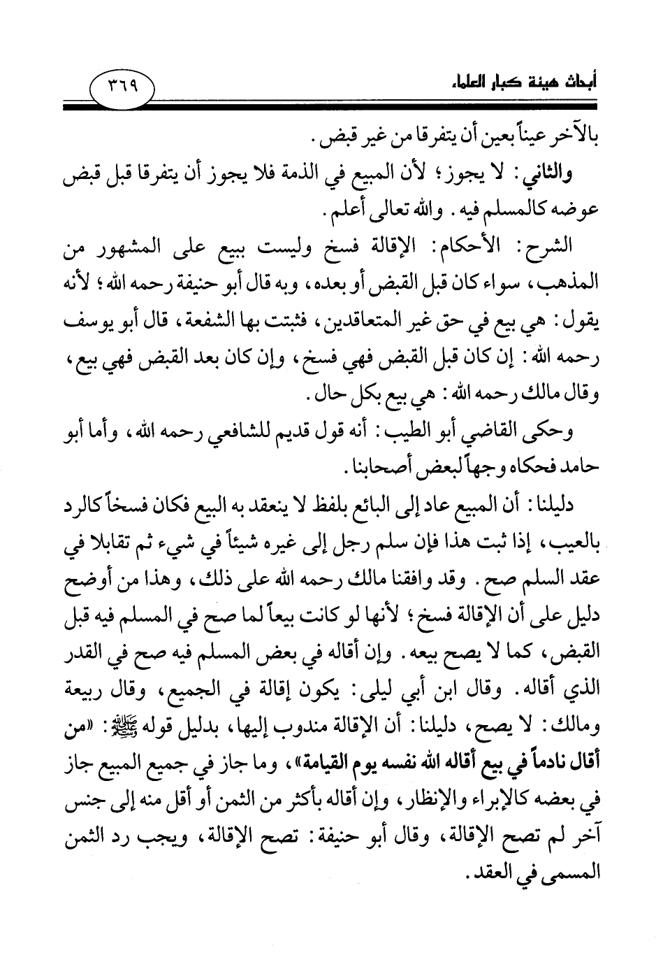 دليلنا: أن المبيع عاد إلى البائع بلفظ لا ينعقد به البيع فكان فسخا كالرد بالعيب، إذا ثبت هذا فإن سلم رجل إلى غيره شيئا في شيء ثم تقابلا في عقد السلم صح، وقد وافقنا مالك رحمه الله على ذلك، وهذا من أوضح دليل على أن الإقالة فسخ، لأنها لو كانت بيعا لما صح في المسلم فيه قبل القبض، كما لا يصح بيعه، وإن أقاله في بعض المسلم فيه صح في القدر الذي أقاله، وقال ابن أبي ليلى: يكون إقالة في الجميع، وقال ربيعة ومالك: لا يصح، دليلنا: أن الإقالة مندوب إليها، بدليل قوله صلى الله عليه وسلم: «من أقال نادما في بيع أقاله الله نفسه يوم القيامة (¬1) » ، وما جاز في جميع المبيع جاز في بعضه كالإبراء والإنظار، وإن أقاله بأكثر من الثمن أو أقل منه إلى جنس آخر لم تصح الإقالة، وقال أبو حنيفة: تصح الإقالة، ويجب رد الثمن المسمى في العقد.