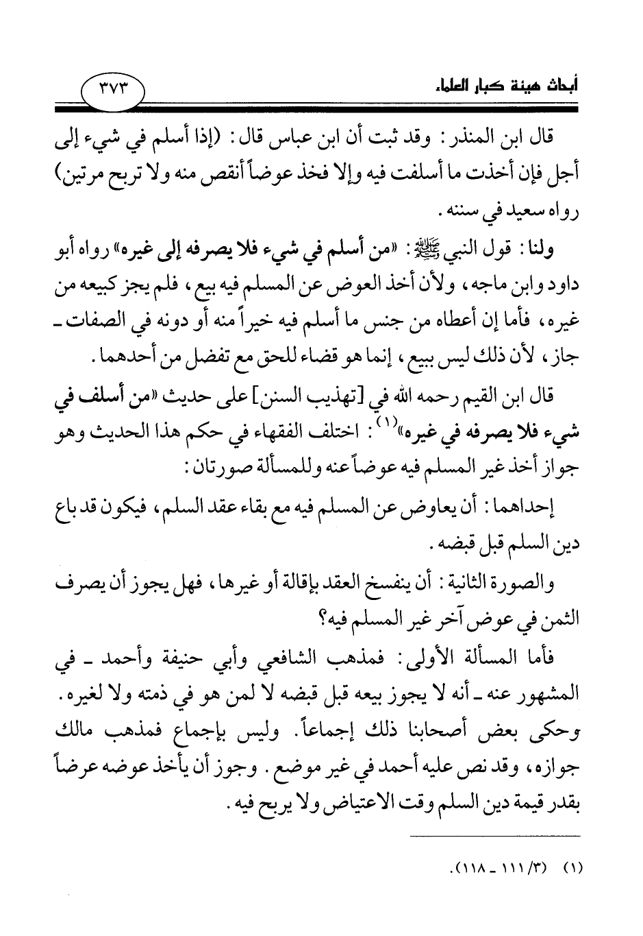 قال ابن القيم رحمه الله في [تهذيب السنن] على حديث «من أسلف في شيء فلا يصرفه في غيره (¬1) » (¬2) : اختلف الفقهاء في حكم هذا الحديث وهو جواز أخذ غير المسلم فيه عوضا عنه وللمسألة صورتان: