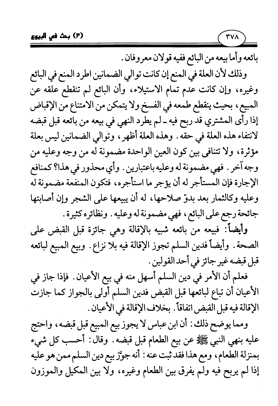 ومما يوضح ذلك: أن ابن عباس لا يجوز بيع المبيع قبل قبضه، واحتج عليه بنهي النبي صلى الله عليه وسلم عن بيع الطعام قبل قبضه، وقال: أحسب كل شيء بمنزلة الطعام، ومع هذا فقد ثبت عنه: أنه جوز بيع دين السلم ممن هو عليه إذا لم يربح فيه ولم يفرق بين الطعام وغيره، ولا بين المكيل والموزون