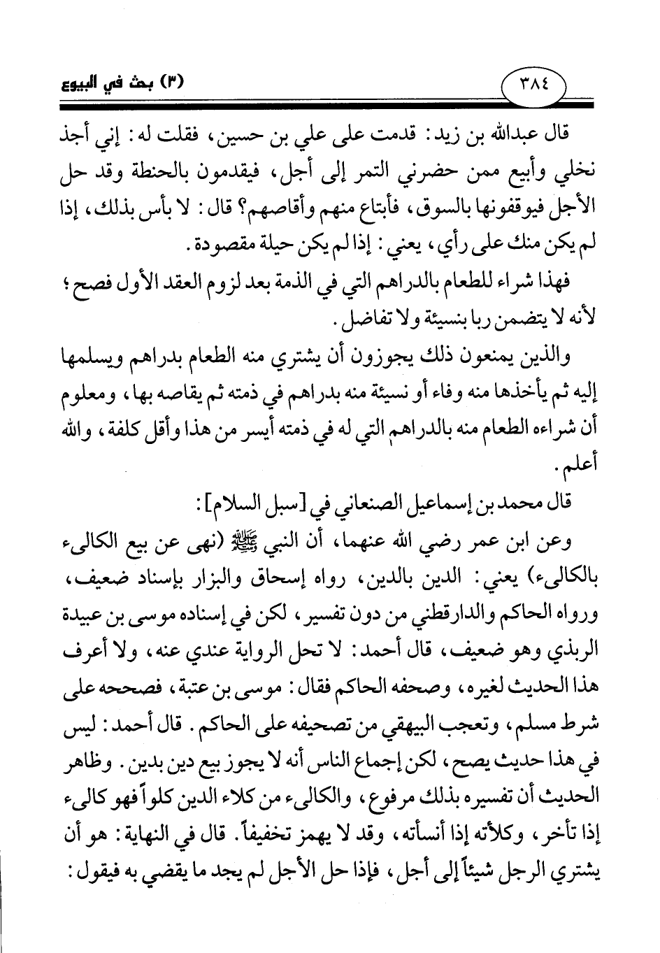 قال عبد الله بن زيد: قدمت على علي بن حسين، فقلت له: إني أجذ نخلي وأبيع ممن حضرني التمر إلى أجل، فيقدمون بالحنطة وقد حل الأجل فيوقفونها بالسوق، فأبتاع منهم وأقاصهم؟ قال: لا بأس بذلك، إذا لم يكن منك على رأي، يعني: إذا لم يكن حيلة مقصودة.