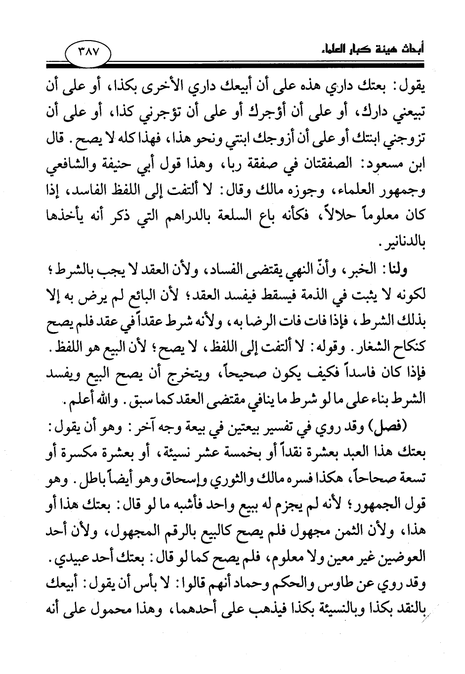 (فصل) وقد روي في تفسير بيعتين في بيعة وجه آخر: وهو أن يقول: بعتك هذا العبد بعشرة نقدا أو بخمسة عشر نسيئة، أو بعشرة مكسرة أو تسعة صحاحا، هكذا فسره مالك والثوري وإسحاق وهو أيضا باطل، وهو قول الجمهور؛ لأنه لم يجزم له ببيع واحد فأشبه ما لو قال: بعتك هذا أو هذا؛ ولأن الثمن مجهول فلم يصح كالبيع بالرقم المجهول؛ ولأن أحد العوضين غير معين ولا معلوم، فلم يصح كما لو قال: بعتك أحد عبيدي، وقد روي عن طاوس والحكم وحماد أنهم قالوا: لا بأس أن يقول: أبيعك بالنقد بكذا وبالنسيئة بكذا فيذهب على أحدهما، وهذا محمول على أنه