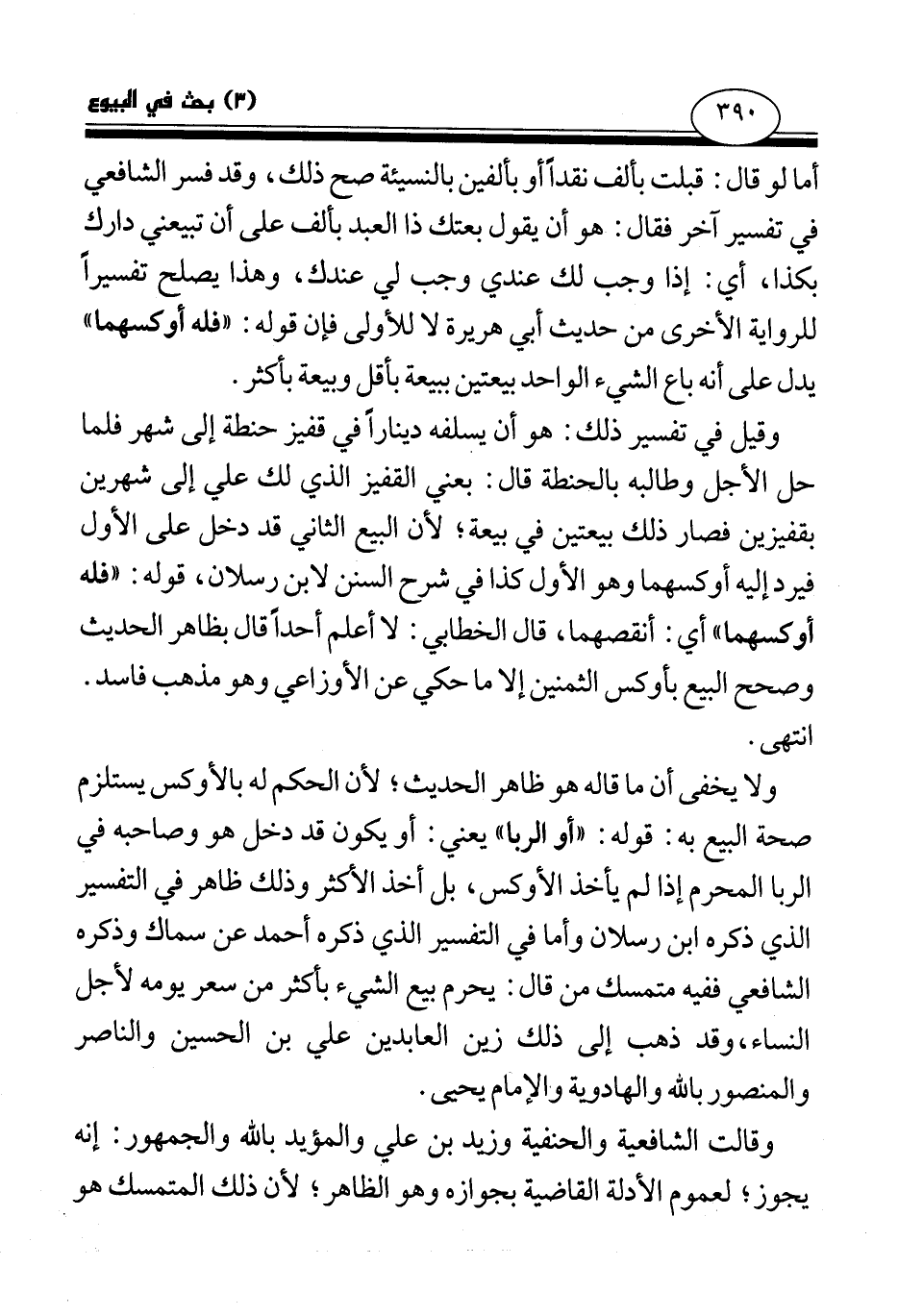 ولا يخفى أن ما قاله هو ظاهر الحديث؛ لأن الحكم له بالأوكس يستلزم صحة البيع به: قوله: «أو الربا (¬2) » يعني: أو يكون قد دخل هو وصاحبه في الربا المحرم إذا لم يأخذ الأوكس، بل أخذ الأكثر وذلك ظاهر في التفسير الذي ذكره ابن رسلان، وأما في التفسير الذي ذكره أحمد عن سماك وذكره الشافعي ففيه متمسك، من قال: يحرم بيع الشيء بأكثر من سعر يومه لأجل النساء، وقد ذهب إلى ذلك زين العابدين علي بن الحسين والناصر والمنصور بالله والهادوية والإمام يحيى.
