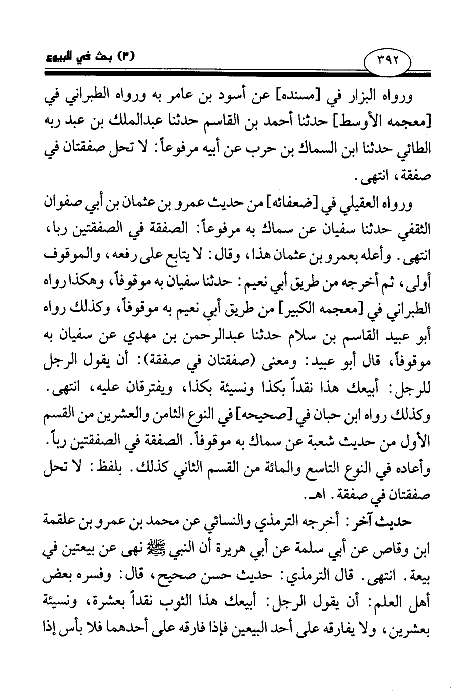 ورواه العقيلي في [ضعفائه] ، من حديث عمرو بن عثمان بن أبي صفوان الثقفي حدثنا سفيان عن سماك به مرفوعا: «الصفقة في الصفتين ربا،» انتهى، وأعله بعمرو بن عثمان هذا، وقال: لا يتابع على رفعه، والموقوف أولى، ثم أخرجه من طريق أبي نعيم: حدثنا سفيان به موقوفا، وهكذا رواه الطبراني في [معجمه الكبير] من طريق أبي نعيم به موقوفا، وكذلك رواه أبو عبيد القاسم بن سلام حدثنا عبد الرحمن بن مهدي عن سفيان به موقوفا، قال أبو عبيد: ومعنى (صفقتان في صفقة) : أن يقول الرجل للرجل: أبيعك هذا نقدا بكذا ونسيئة بكذا، ويفترقان عليه، انتهى.