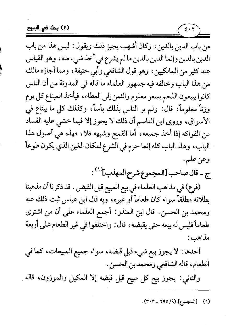 ج ـ قال صاحب [المجموع شرح المهذب] (¬1) (فرع) في مذاهب العلماء في بيع المبيع قبل القبض، وقد ذكرنا أن مذهبنا بطلانه مطلقا سواء كان الطعام أو غيره، وبه قال ابن عباس ثبت ذلك عنه ومحمد بن الحسن، قال ابن المنذر، أجمع العلماء على أن من اشترى طعاما فليس له بيعه حتى يقبضه، قال: واختلفوا في غير الطعام على أربعة مذاهب: