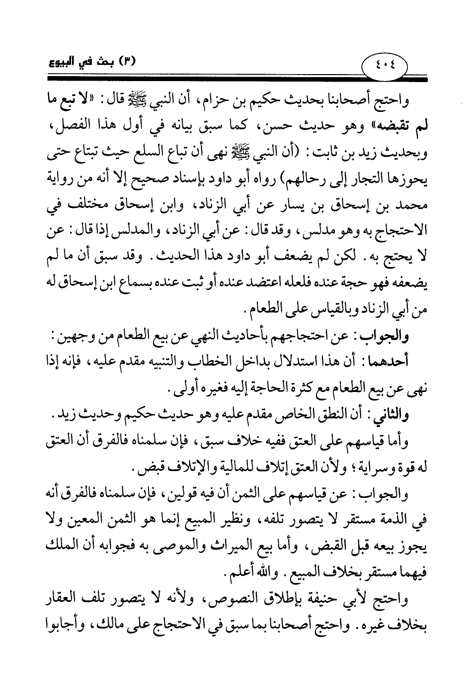 واحتج أصحابنا بحديث حكيم بن حزام، أن النبي صلى الله عليه وسلم قال: «لا تبع ما لم تقبضه» وهو حديث حسن، كما سبق بيانه في أول هذا الفصل. وبحديث زيد بن ثابت: أن النبي صلى الله عليه وسلم «نهى أن تباع السلع حيث تبتاع حتى يحوزها التجار إلى رحالهم (¬1) » رواه أبو داود بإسناد صحيح إلا أنه من رواية محمد بن إسحاق بن يسار عن أبي الزناد، وابن إسحاق مختلف في الاحتجاج به وهو مدلس، وقد قال: عن أبي الزناد، والمدلس إذا قال: "عن" لا يحتج به. لكن لم يضعف أبو داود هذا الحديث، وقد سبق أن ما لم يضعفه فهو حجة عنده فلعله اعتضد عنده أو ثبت عنده بسماع ابن إسحاق له من أبي الزناد وبالقياس على الطعام.