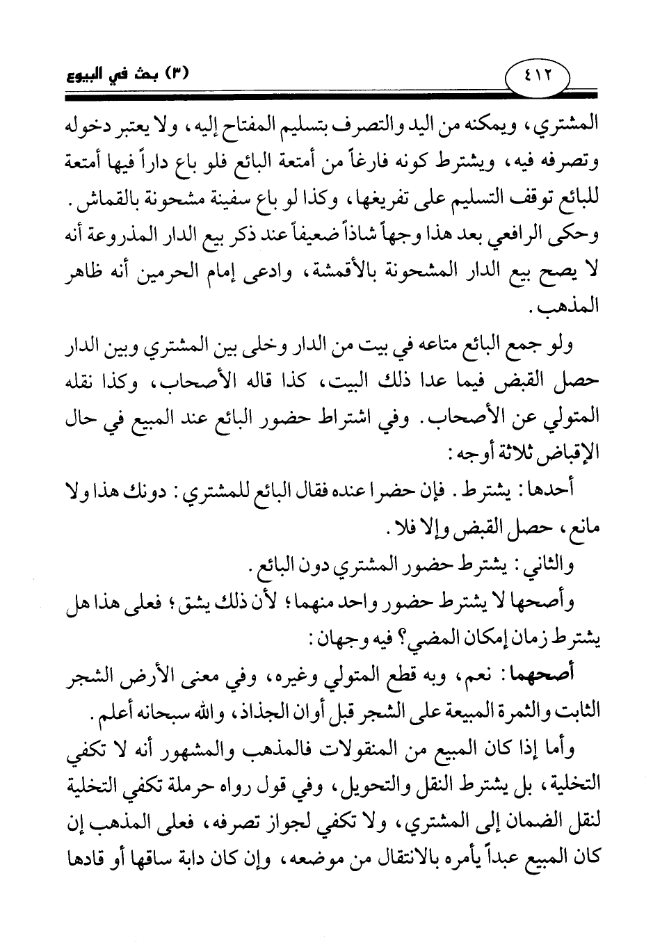 المشتري، ويمكنه من اليد والتصرف بتسليم المفتاح إليه، ولا يعتبر دخوله وتصرفه فيه، ويشترط كونه فارغا من أمتعة البائع فلو باع دارا فيها أمتعة للبائع توقف التسليم على تفريغها، وكذا لو باع سفينة مشحونة بالقماش. وحكى الرافعي بعد هذا وجها شاذا ضعيفا عند ذكر بيع الدار المذروعة أنه لا يصح بيع الدار المشحونة بالأقمشة، وادعى إمام الحرمين أنه ظاهر المذهب.