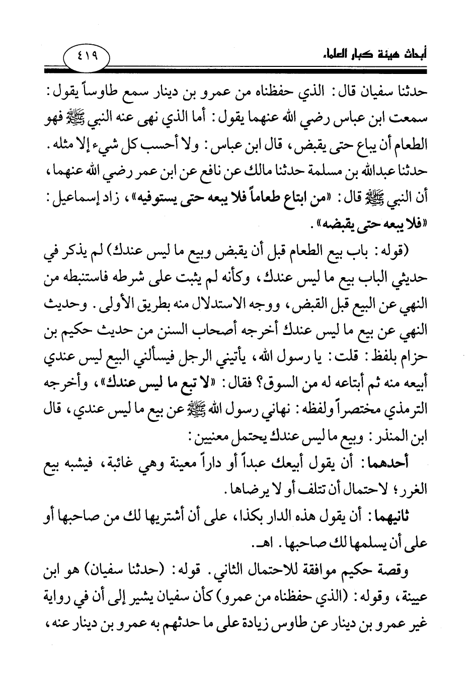 حدثنا سفيان قال: الذي حفظناه من عمرو بن دينار سمع طاوسا يقول: سمعت ابن عباس رضي الله عنهما يقول: أما الذي نهى عنه النبي صلى الله عليه وسلم فهو الطعام أن يباع حتى يقبض، قال ابن عباس: ولا أحسب كل شيء إلا مثله. حدثنا عبد الله بن مسلمة حدثنا مالك عن نافع عن ابن عمر رضي الله عنهما، أن النبي صلى الله عليه وسلم قال: «من ابتاع طعاما فلا يبعه حتى يستوفيه» ، زاد إسماعيل: فلا يبعه حتى يقبضه.