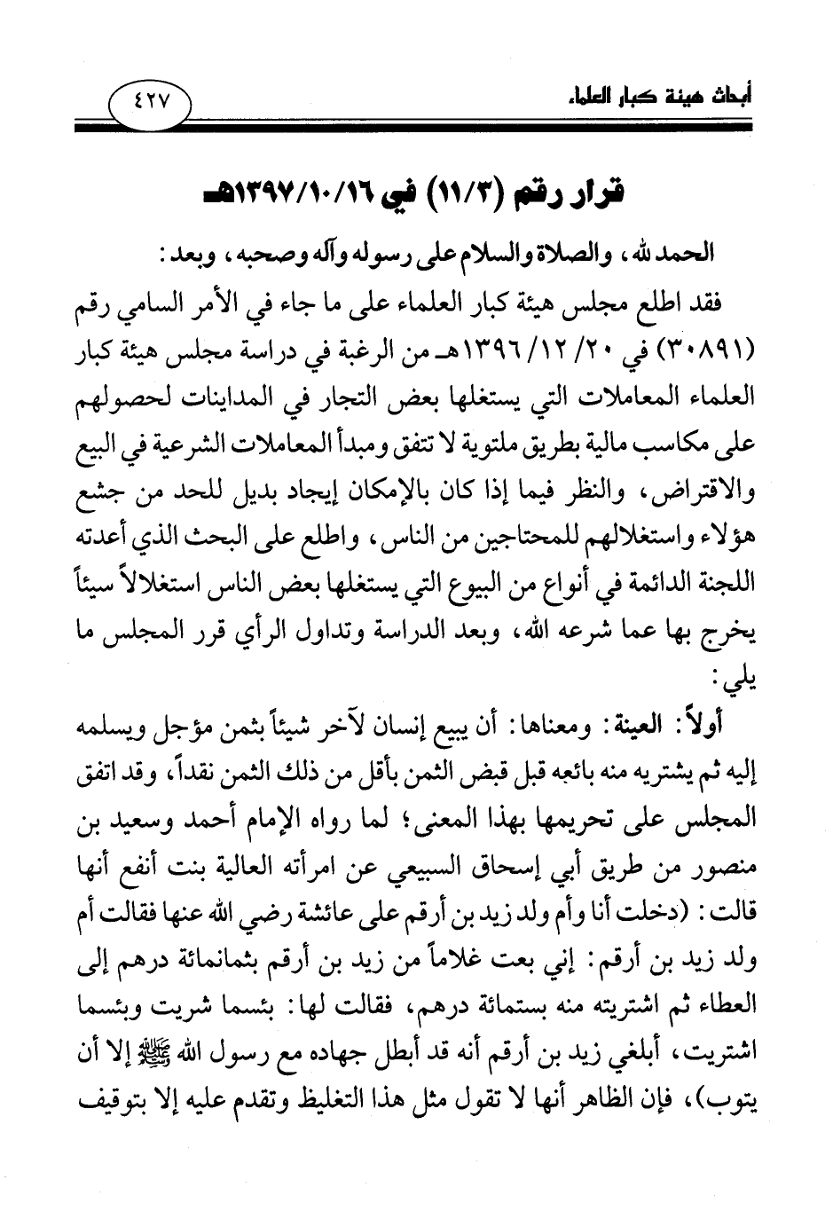 الحمد لله، والصلاة والسلام على رسوله وآله وصحبه، وبعد: فقد اطلع مجلس هيئة كبار العلماء على ما جاء في الأمر السامي رقم (30891) في 20 \ 12 \ 1396 هـ من الرغبة في دراسة مجلس هيئة كبار العلماء المعاملات التي يستغلها بعض التجار في المداينات لحصولهم على مكاسب مالية بطريق ملتوية لا تتفق ومبدأ المعاملات الشرعية في البيع والاقتراض، والنظر فيما إذا كان بالإمكان إيجاد بديل للحد من جشع هؤلاء واستغلالهم للمحتاجين من الناس، واطلع على البحث الذي أعدته اللجنة الدائمة في أنواع من البيوع التي يستغلها بعض الناس استغلالا سيئا يخرج بها عما شرعه الله، وبعد الدراسة وتداول الرأي قرر المجلس ما يلي: