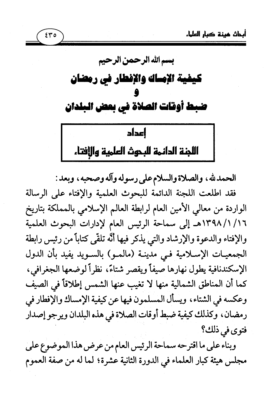 فقد اطلعت اللجنة الدائمة للبحوث العلمية والإفتاء على الرسالة الواردة من معالي الأمين العام لرابطة العالم الإسلامي بالمملكة بتاريخ 16 / 1 / 1398 هـ إلى سماحة الرئيس العام لإدارات البحوث العلمية والإفتاء والدعوة والإرشاد والتي يذكر فيها أنه تلقى كتابا من رئيس رابطة الجمعيات الإسلامية في مدينة (مالمو) بالسويد يفيد بأن الدول الإسكندنافية يطول نهارها صيفا ويقصر شتاء، نظرا لوضعها الجغرافي، كما أن المناطق الشمالية منها لا تغيب عنها الشمس إطلاقا في الصيف وعكسه في الشتاء، ويسأل المسلمون فيها عن كيفية الإمساك والإفطار في رمضان، وكذلك كيفية ضبط أوقات الصلاة في هذه البلدان ويرجو إصدار فتوى في ذلك؟