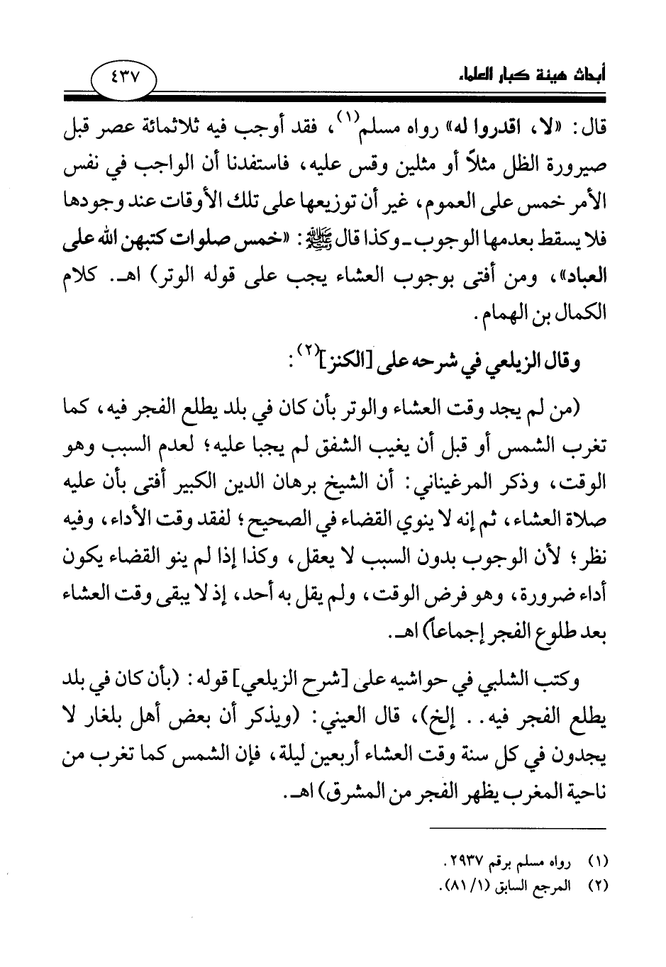 قال: لا، اقدروا له (¬1) » رواه مسلم (¬2) ، فقد أوجب فيه ثلاثمائة عصر قبل صيرورة الظل مثلا أو مثلين وقس عليه، فاستفدنا أن الواجب في نفس الأمر خمس على العموم، غير أن توزيعها على تلك الأوقات عند وجودها فلا يسقط بعدمها الوجوب- وكذا قال صلى الله عليه وسلم: «خمس صلوات كتبهن الله على العباد (¬3) » ، ومن أفتى بوجوب العشاء يجب على قوله الوتر) اهـ. كلام الكمال بن الهمام.