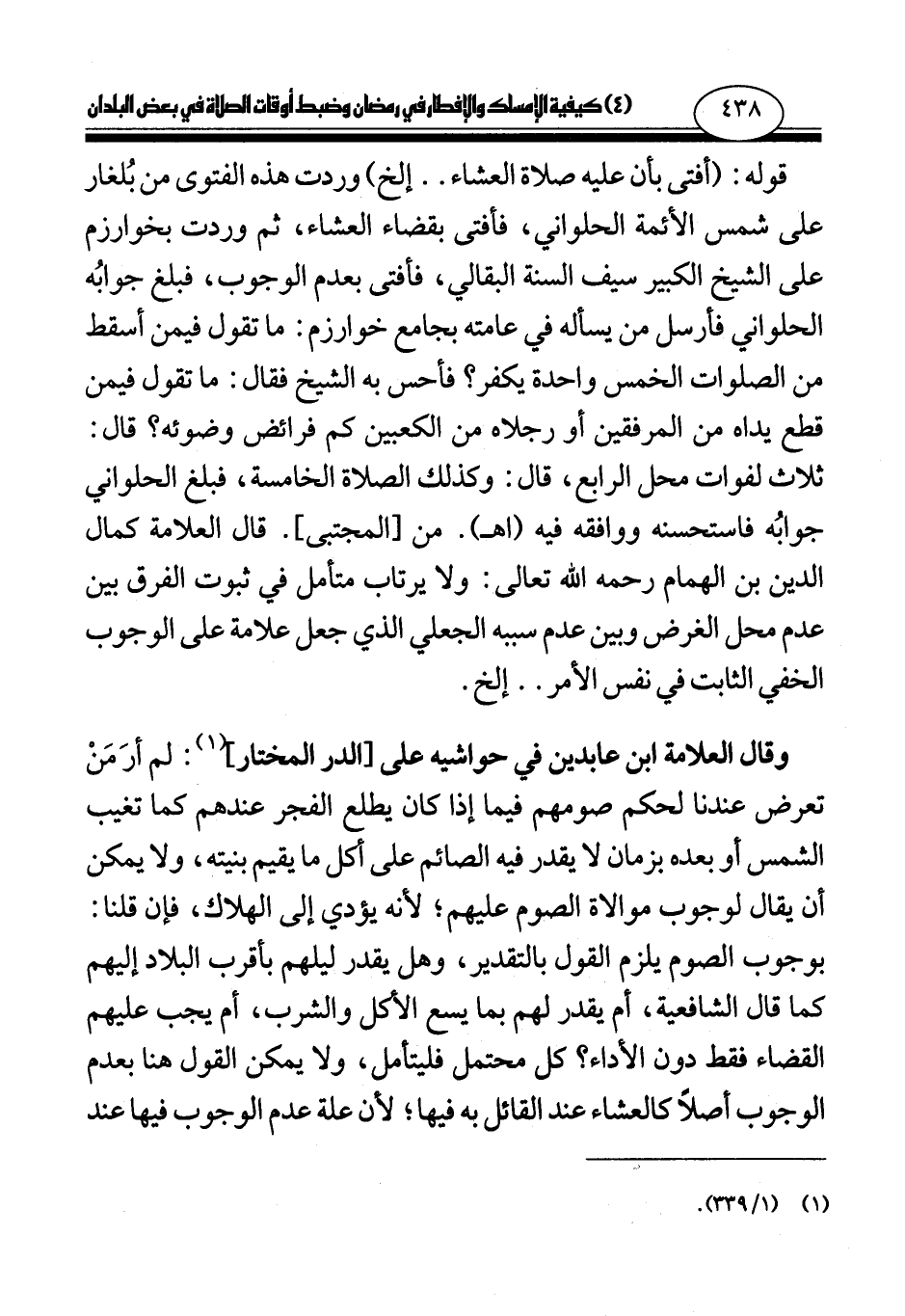 وقال العلامة ابن عابدين في حواشيه على [الدر المختار] (¬1) : لم أر من تعرض عندنا دع صومهم فيما إذا كان يطلع الفجر عندهم كما تغيب الشمس أو بعده بزمان لا يقدر فيه الصائم على أكل ما يقيم بنيته، ولا يمكن أن يقال لوجوب موالاة الصوم عليهم؛ لأنه يؤدي إلى الهلاك، فإن قلنا: بوجوب الصوم يلزم القول بالتقدير، وهل يقدر ليلهم بأقرب البلاد إليهم كما قال الشافعية " أم يقدر لهم بما يسع الأكل والشرب، أم يجب عليهم القضاء فقط دون الأداء؟ كل محتمل فليتأمل، ولا يمكن القول هنا بعدم الوجوب أصلا كالعشاء عند القائل به فيها؛ لأن علة عدم الوجوب فيها عند