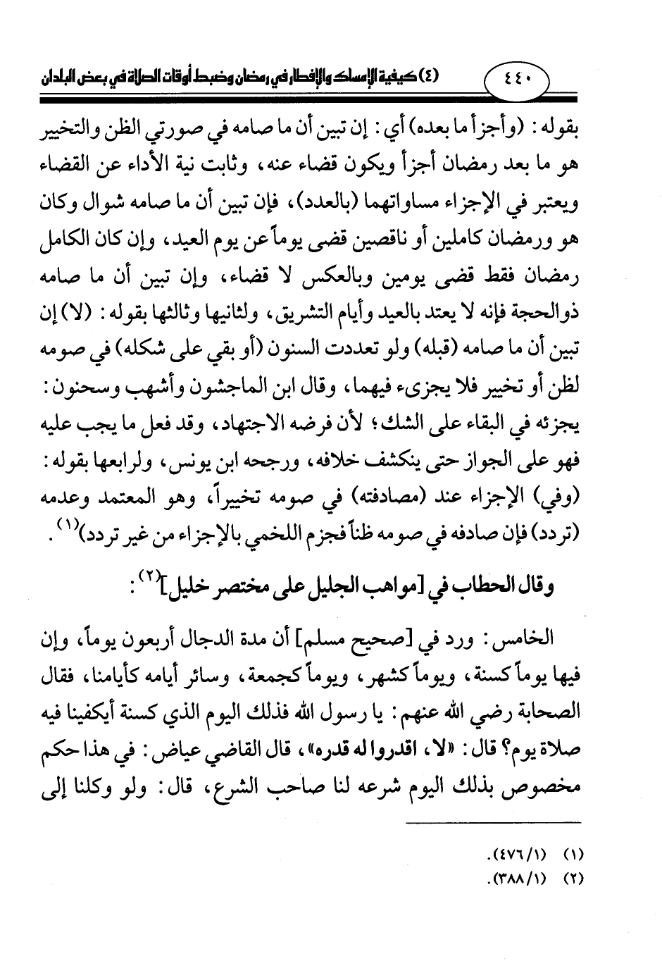 وقال الحطاب في [مواهب الجليل على مختصر خليل] (¬1) : الخامس: ورد في [صحيح مسلم] «أن مدة الدجال أربعون يوما، وإن فيها يوما كسنة، ويوما كشهر، ويوما كجمعة، وسائر أيامه كأيامنا، فقال الصحابة رضي الله عنهم: يا رسول الله فذلك اليوم الذي كسنة أيكفينا فيه صلاة يوم؟ قال: لا، اقدروا له قدره (¬2) » ، قال القاضي عياض: في هذا حكم مخصوص بذلك اليوم شرعه لنا صاحب الشرع، قال: ولو وكلنا إلى