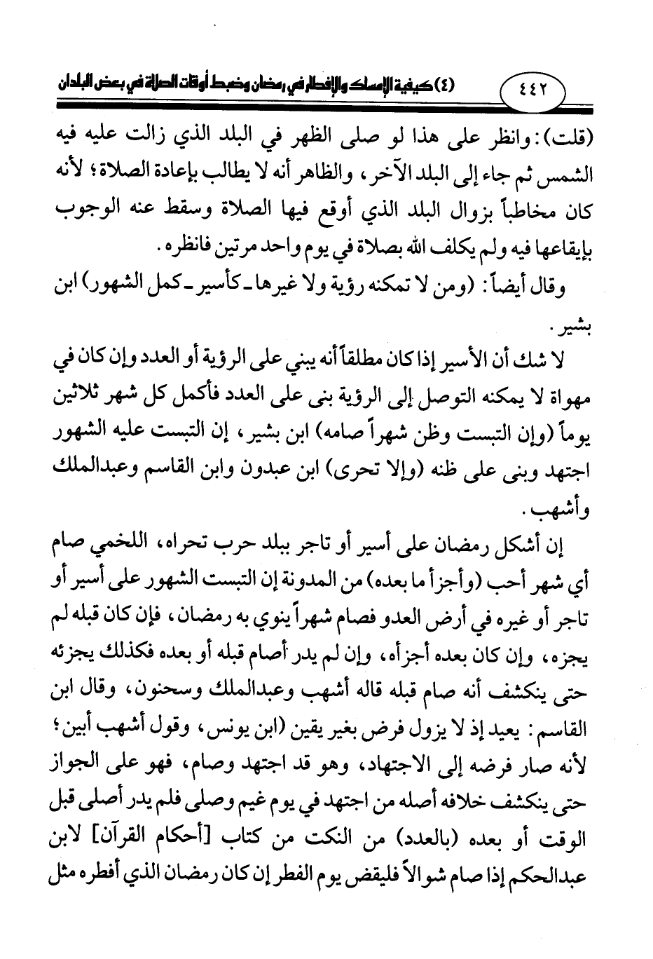 إن أشكل رمضان على أسير أو تاجر ببلد حرب تحراه، اللخمي صام أي شهر أحب (وأجزأ ما بعده) من المدونة إن التبست الشهور على أسير أو تاجر أو غيره في أرض العدو فصام شهرا ينوي به رمضان، فإن كان قبله لم يجزه، وإن كان بعده أجزأه، وإن لم يدر أصام قبله أو بعده فكذلك يجزئه حتى ينكشف أنه صام قبله قاله أشهب وعبد الملك وسحنون، وقال ابن القاسم: يعيد إذ لا يزول فرض بغير يقين (ابن يونس، وقول أشهب أبين؛ لأنه صار فرضه إلى الاجتهاد، وهو قد اجتهد وصام، فهو على الجواز حتى ينكشف خلافه أصله من اجتهد في يوم غيم وصلى فلم يدر أصلى قبل الوقت أو بعده (بالعدد) من النكت من كتاب [أحكام القران] لابن عبد الحكم إذا صام شوالا فليقض يوم الفطر إن كان رمضان الذي أفطره مثل