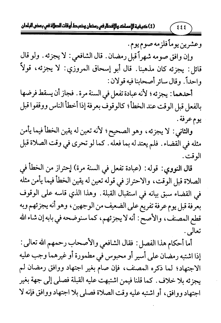 قال النووي: قوله: (عبادة تفعل في السنة مرة) احتراز من الخطأ في الصلاة قبل الوقت، والاحتراز في قوله تعين له يقين الخطأ فيما يأمن مثله في القضاء سبق بيانه في استقبال القبلة. وهذا الذي قاسه على الوقوف بعرفة قبل يوم عرفة تفريع على الضعيف من الوجهين، وهو أنه يجزئهم وبه قطع المصنف، والأصح: أنه لا يجزئهم، كما سنوضحه في بابه إن شاء الله تعالى.