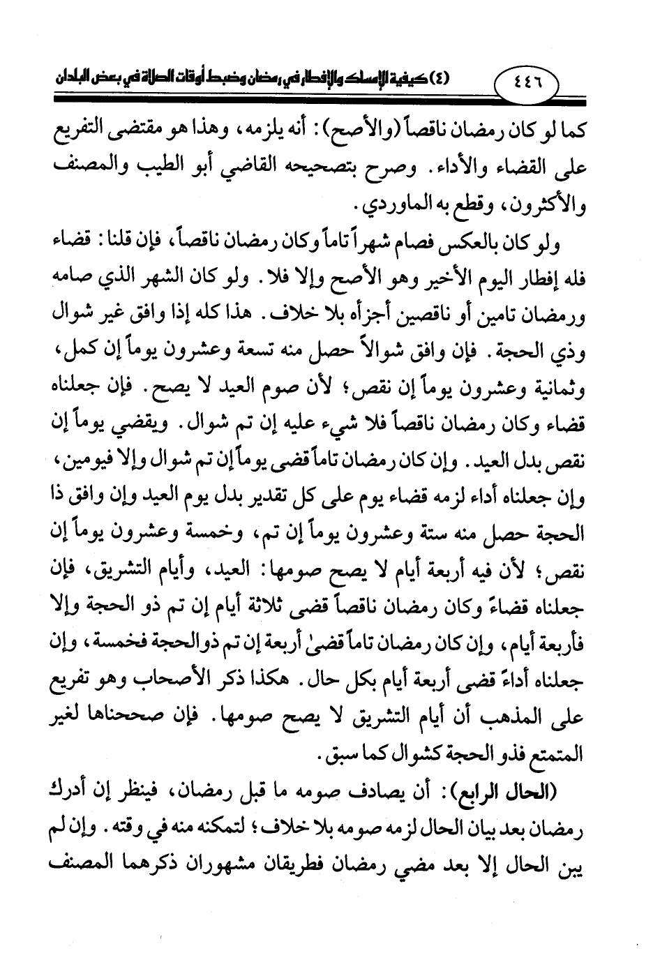 ولو كان بالعكس فصام شهرا تاما وكان رمضان ناقصا، فإن قلنا: قضاء فله إفطار اليوم الأخير وهو الأصح وإلا فلا. ولو كان الشهر الذي صامه ورمضان تامين أو ناقصين أجزأه بلا خلاف. هذا كله إذا وافق غير شوال وذي الحجة. فإن وافق شوالا حصل منه تسعة وعشرون يوما إن كمل، وثمانية وعشرون يوما إن نقص؛ لأن صوم العيد لا يصح. فإن جعلناه قضاء وكان رمضان ناقصا فلا شيء عليه إن تم شوال. ويقضي يوما إن نقص بدل العيد. وإن كان رمضان تاما قضى يوما إن تم شوال وإلا فيومين، وإن جعلناه أداء لزمه قضاء يوم على كل تقدير بدل يوم العيد وإن وافق ذا الحجة حصل منه ستة وعشرون يوما إن تم، وخمسة وعشرون يوما إن نقص؛ لأن فيه أربعة أيام لا يصح صومها: العيد، وأيام التشريق، فإن جعلناه قضاء وكان رمضان ناقصا قضى ثلاثة أيام إن تم ذو الحجة وإلا فأربعة أيام، وإن كان رمضان تاما قضى أربعة إن تم ذو الحجة فخمسة، وإن جعلناه أداء قضى أربعة أيام بكل حال. هكذا ذكر الأصحاب وهو تفريع على المذهب أن أيام التشريق لا يصح صومها. فإن صححناها لغير المتمتع فذو الحجة كشوال كما سبق.