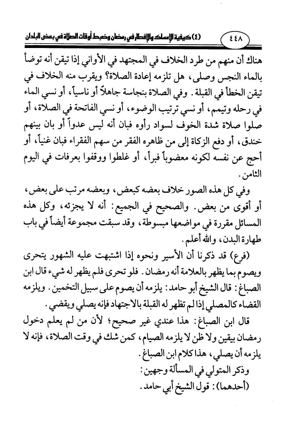قال ابن الصباغ: هذا عندي غير صحيح؛ لأن من لم يعلم دخول رمضان بيقين ولا ظن لا يلزمه الصيام، كمن شك في وقت الصلاة، فإنه لا يلزمه أن يصلي، هذا كلام ابن الصباغ.