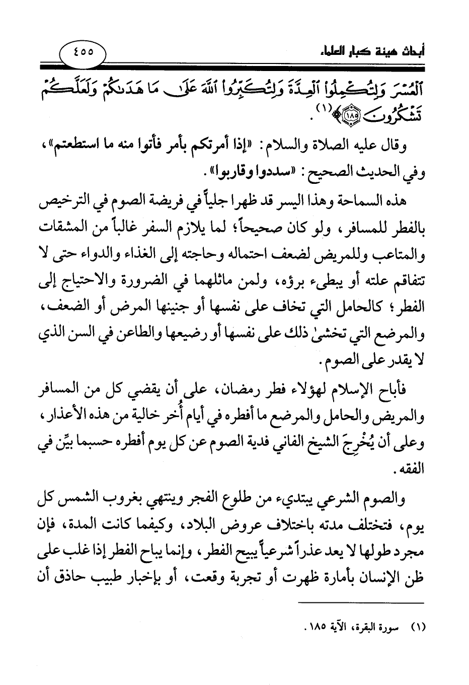 هذه السماحة وهذا اليسر قد ظهرا جليا في فريضة الصوم في الترخيص بالفطر للمسافر، ولو كان صحيحا؛ لما يلازم السفر غالبا من المشقات والمتاعب، وللمريض لضعف احتماله وحاجته إلى الغذاء والدواء حتى لا تتفاقم علته أو يبطئ برؤه، ولمن ماثلهما في الضرورة والاحتياج إلى الفطر؛ كالحامل التي تخاف على نفسها أو جنينها المرض أو الضعف، والمرضع التي تخشى ذلك على نفسها أو رضيعها والطاعن في السن الذي لا يقدر على الصوم.