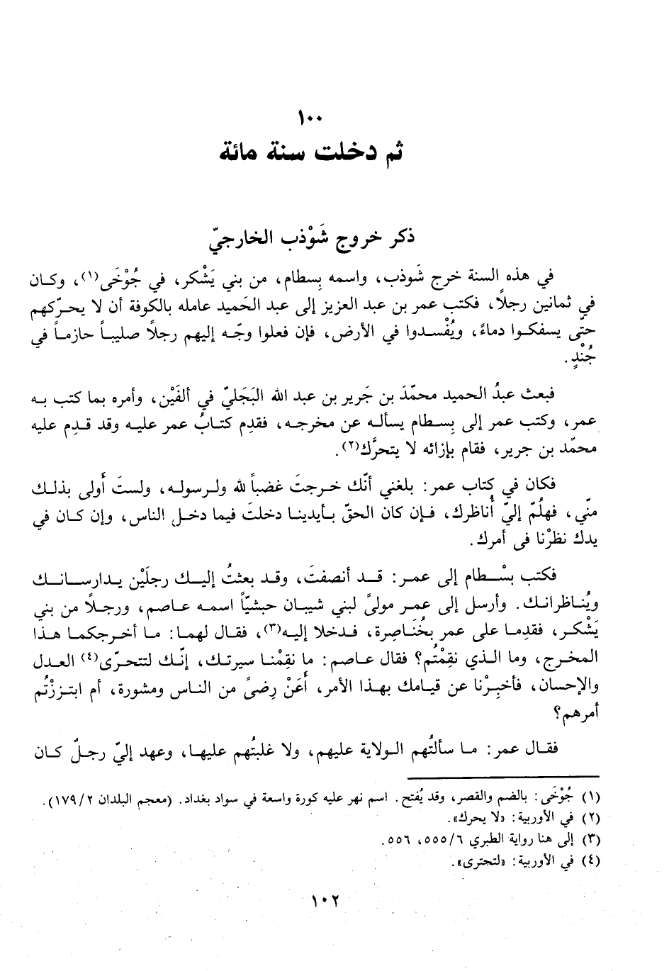 فِي هَذِهِ السَّنَةِ خَرَجَ شَوْذَبٌ، وَاسْمُهُ بِسْطَامٌ، مِنْ بَنِي يَشْكُرَ، فِي جُوخَى، وَكَانَ فِي ثَمَانِينَ رَجُلًا، فَكَتَبَ عُمَرُ بْنُ عَبْدِ الْعَزِيزِ إِلَى عَبْدِ الْحَمِيدِ عَامِلِهِ بِالْكُوفَةِ أَنْ لَا يُحَرِّكَهُمْ حَتَّى يَسْفِكُوا دِمَاءً، وَيُفْسِدُوا فِي الْأَرْضِ، فَإِنْ فَعَلُوا وَجِّهْ إِلَيْهِمْ رَجُلًا صَلِيبًا حَازِمًا فِي جُنْدٍ.