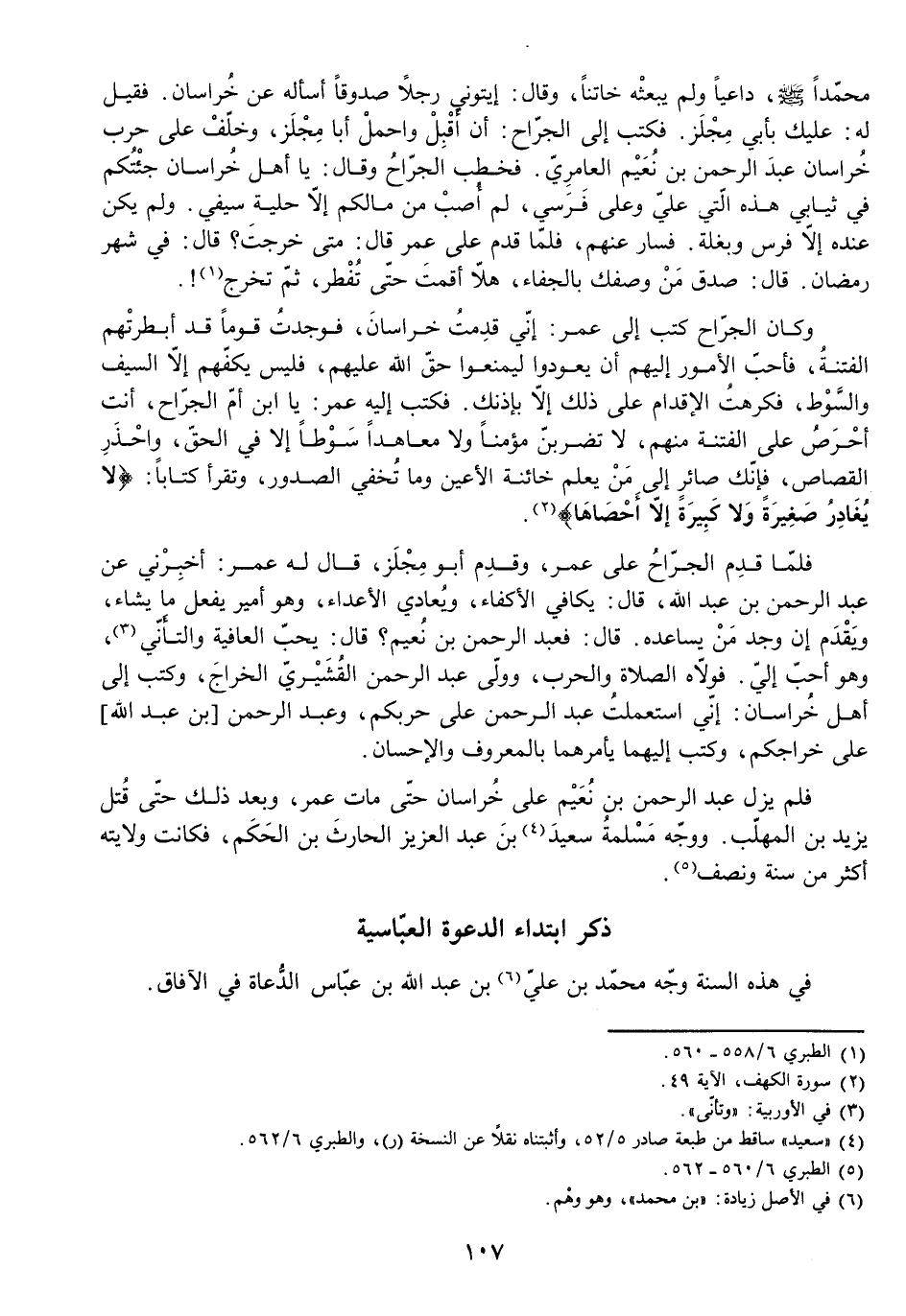 وَكَانَ الْجَرَّاحُ كَتَبَ إِلَى عُمَرَ: إِنِّي قَدِمْتُ خُرَاسَانَ، فَوَجَدْتُ قَوْمًا قَدْ أَبْطَرَتْهُمُ الْفِتْنَةُ، فَأَحَبُّ الْأُمُورِ إِلَيْهِمْ أَنْ يَعُودُوا لِيَمْنَعُوا حَقَّ اللَّهِ عَلَيْهِمْ، فَلَيْسَ يَكْفِهِمْ إِلَّا السَّيْفُ وَالسَّوْطُ، فَكَرِهْتُ الْإِقْدَامَ عَلَى ذَلِكَ إِلَّا بِإِذْنِكَ. فَكَتَبَ إِلَيْهِ عُمَرُ: يَا ابْنَ أُمِّ الْجَرَّاحِ، أَنْتَ أَحْرَصُ عَلَى الْفِتْنَةِ مِنْهُمْ، لَا تَضْرِبَنَّ مُؤْمِنًا وَلَا مُعَاهِدًا سَوْطًا إِلَّا فِي الْحَقِّ، وَاحْذَرِ الْقِصَاصَ، فَإِنَّكَ صَائِرٌ إِلَى مَنْ يَعْلَمُ خَائِنَةَ الْأَعْيُنِ وَمَا تُخْفِي الصُّدُورُ، وَتَقْرَأُ كِتَابًا: {لَا يُغَادِرُ صَغِيرَةً وَلَا كَبِيرَةً إِلَّا أَحْصَاهَا} [الكهف: 49] .