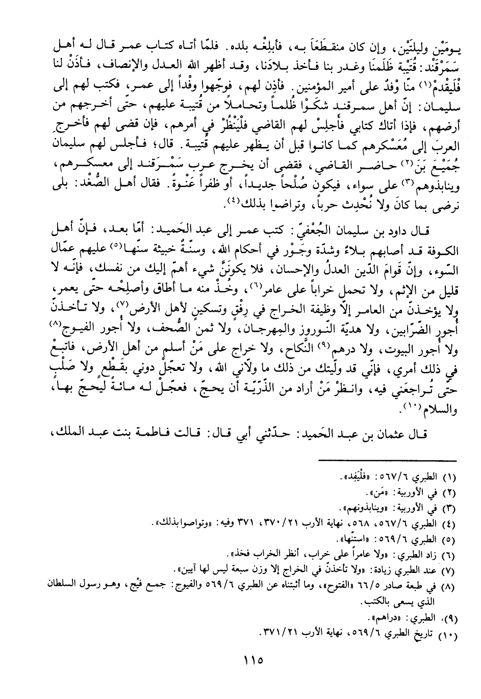 قَالَ دَاوُدُ بْنُ سُلَيْمَانَ الْجُعْفِيُّ: كَتَبَ عُمَرُ إِلَى عَبْدِ الْحَمِيدِ: أَمَّا بَعْدُ، فَإِنَّ أَهْلَ الْكُوفَةِ قَدْ أَصَابَهُمْ بَلَاءٌ وَشِدَّةٌ وَجَوْرٌ فِي أَحْكَامِ اللَّهِ، وَسُنَّةٌ خَبِيثَةٌ سَنَّهَا عَلَيْهِمْ عُمَّالُ السُّوءِ، وَإِنَّ قِوَامَ الدِّينِ الْعَدْلُ وَالْإِحْسَانُ، فَلَا يَكُونَنَّ شَيْءٌ أَهَمَّ إِلَيْكَ مِنْ نَفْسِكَ، فَإِنَّهُ لَا قَلِيلَ مِنَ الْإِثْمِ، وَلَا تَحْمِلْ خَرَابًا عَلَى عَامِرٍ، وَخُذْ مِنْهُ مَا أَطَاقَ، وَأَصْلِحْهُ حَتَّى يُعَمَّرَ، وَلَا يُؤْخَذَنَّ مِنَ الْعَامِرِ إِلَّا وَظِيفَةَ الْخَرَاجِ فِي رِفْقٍ وَتَسْكِينٍ لِأَهْلِ الْأَرْضِ، وَلَا تَأْخُذَنَّ أُجُورَ الضَّرَّابِينَ، وَلَا هَدِيَّةَ النَّوْرُوزِ وَالْمَهْرَجَانِ، وَلَا ثَمَنَ الصُّحُفِ، وَلَا أُجُورَ الْفُيُوجِ، وَلَا أُجُورَ الْبُيُوتِ، وَلَا دِرْهَمَ النِّكَاحِ، وَلَا خَرَاجَ عَلَى مَنْ أَسْلَمَ مِنْ أَهْلِ الْأَرْضِ، فَاتَّبِعْ فِي ذَلِكَ أَمْرِي، فَإِنِّي قَدْ وَلَّيْتُكَ مِنْ ذَلِكَ مَا وَلَّانِي اللَّهُ، وَلَا تُعَجِّلْ دُونِي بِقَطْعٍ وَلَا صَلْبٍ حَتَّى تُرَاجِعَنِي فِيهِ، وَانْظُرْ مَنْ أَرَادَ مِنَ الذُّرِّيَّةِ أَنْ يَحُجَّ، فَعَجِّلْ لَهُ مِائَةً لِيَحُجَّ بِهَا، وَالسَّلَامُ.