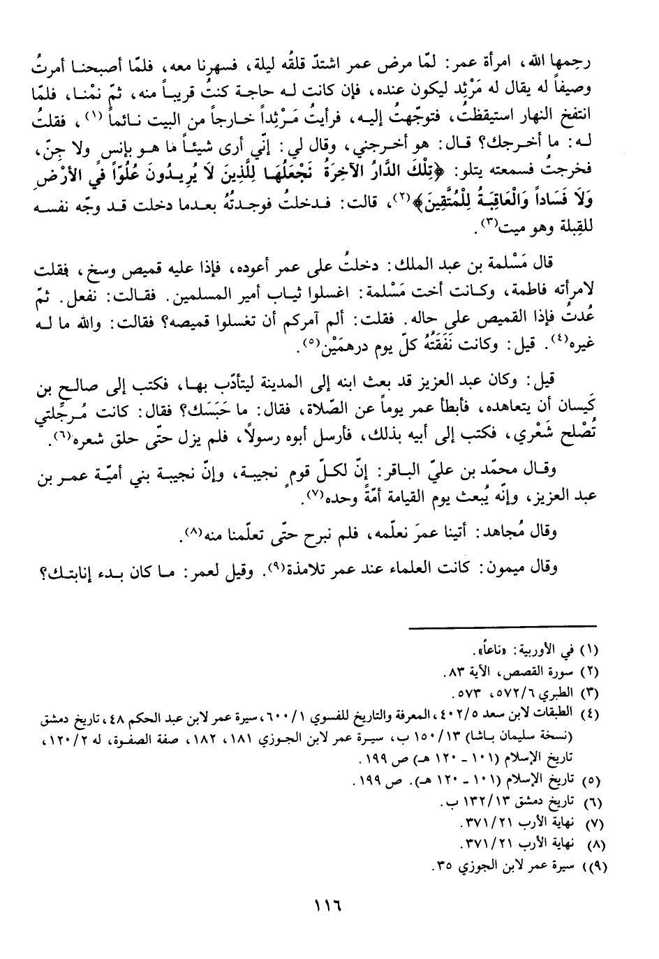 رَحِمَهَا اللَّهُ، امْرَأَةُ عُمَرَ: لَمَّا مَرِضَ عُمَرُ اشْتَدَّ قَلَقُهُ لَيْلَةً، فَسَهِرْنَا مَعَهُ، فَلَمَّا أَصْبَحْنَا أَمَرْتُ وَصِيفًا لَهُ يُقَالُ لَهُ مَرْثَدٌ لِيَكُونَ عِنْدَهُ، فَإِنْ كَانَتْ لَهُ حَاجَةٌ كُنْتُ قَرِيبًا مِنْهُ، ثُمَّ نِمْنَا، فَلَمَّا انْتَفَخَ النَّهَارُ اسْتَيْقَظْتُ، فَتَوَجَّهْتُ إِلَيْهِ، فَرَأَيْتُ مَرْثَدًا خَارِجًا مِنَ الْبَيْتِ نَائِمًا، فَقُلْتُ لَهُ: مَا أَخْرَجَكَ؟ قَالَ: هُوَ أَخْرَجَنِي، وَقَالَ لِي: إِنِّي أَرَى شَيْئًا مَا هُوَ بِإِنْسٍ وَلَا جِنٍّ، فَخَرَجْتُ فَسَمِعْتُهُ يَتْلُو: {تِلْكَ الدَّارُ الْآخِرَةُ نَجْعَلُهَا لِلَّذِينَ لَا يُرِيدُونَ عُلُوًّا فِي الْأَرْضِ وَلَا فَسَادًا وَالْعَاقِبَةُ لِلْمُتَّقِينَ} [القصص: 83] . قَالَتْ: فَدَخَلْتُ فَوَجَدْتُهُ بَعْدَمَا دَخَلْتُ قَدْ وَجَّهَ نَفْسَهُ لِلْقِبْلَةِ وَهُوَ مَيِّتٌ.