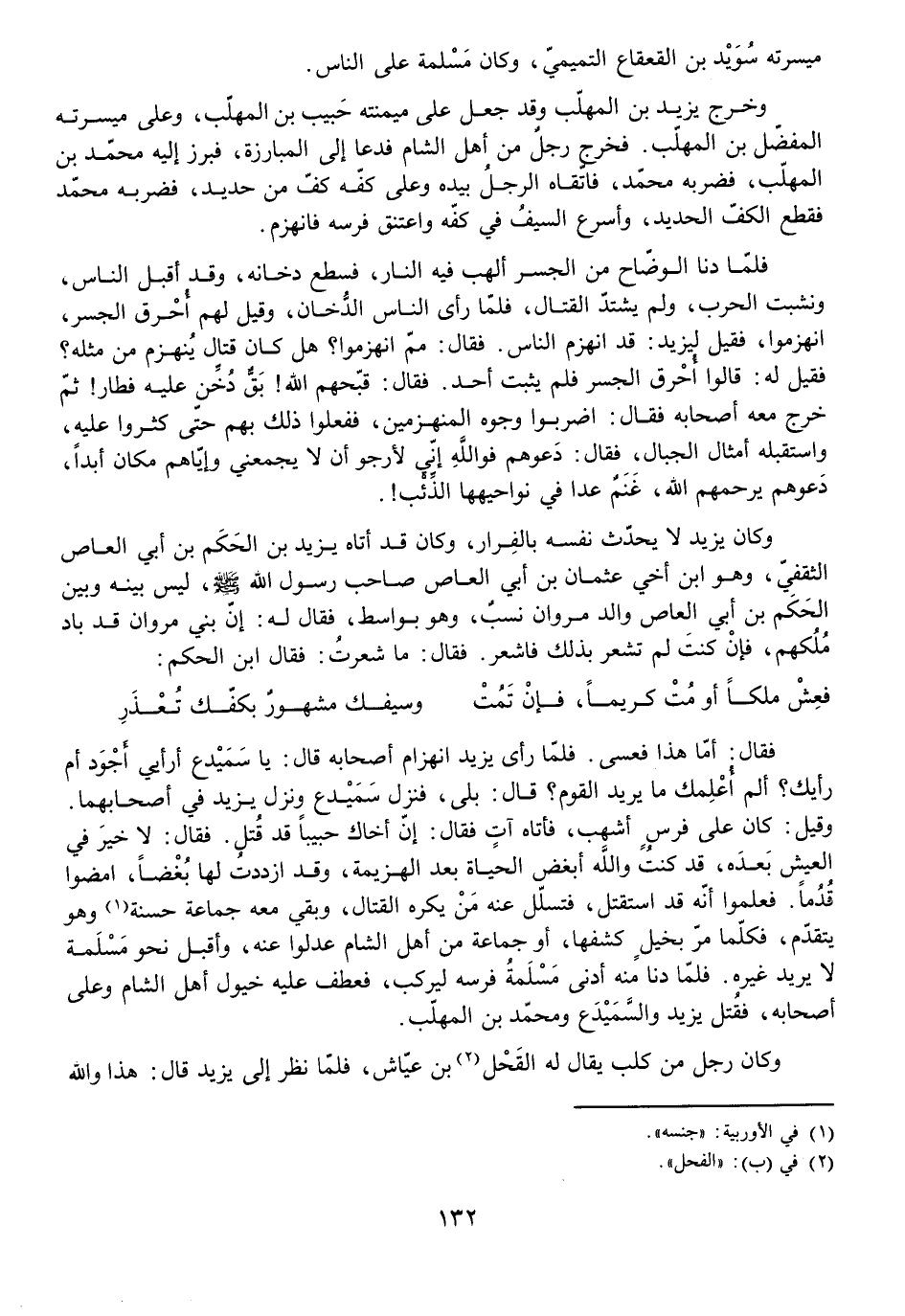 وَخَرَجَ يَزِيدُ بْنُ الْمُهَلَّبِ وَقَدْ جَعَلَ عَلَى مَيْمَنَتِهِ حَبِيبَ بْنَ الْمُهَلَّبِ، وَعَلَى مَيْسَرَتِهِ الْمُفَضَّلَ بْنَ الْمُهَلَّبِ. فَخَرَجَ رَجُلٌ مِنْ أَهْلِ الشَّامِ فَدَعَا إِلَى الْمُبَارَزَةِ، فَبَرَزَ إِلَيْهِ مُحَمَّدُ بْنُ الْمُهَلَّبِ، فَضَرَبَهُ مُحَمَّدٌ، فَاتَّقَاهُ الرَّجُلُ بِيَدِهِ وَعَلَى كَفِّهِ كَفٌّ مِنْ حَدِيدٍ، فَضَرَبَهُ مُحَمَّدٌ فَقَطَعَ الْكَفَّ الْحَدِيدَ، وَأَسْرَعَ السَّيْفُ فِي كَفِّهِ وَاعْتَنَقَ فَرَسَهُ فَانْهَزَمَ.