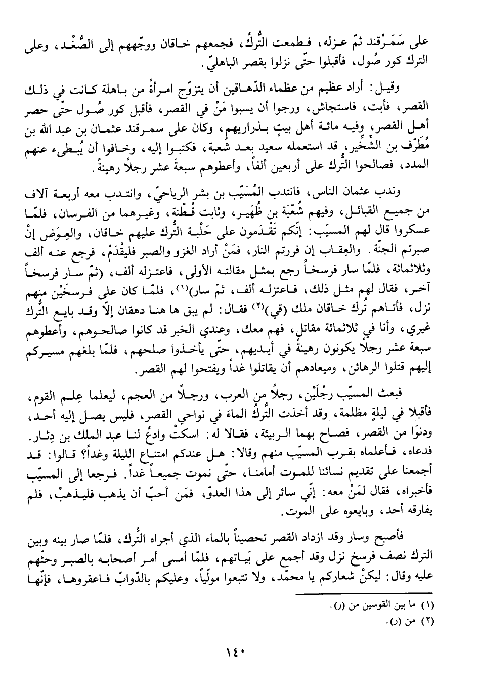 وَنَدَبَ عُثْمَانُ النَّاسَ، فَانْتَدَبَ الْمُسَيَّبَ بْنَ بِشْرٍ الرِّيَاحَيَّ، وَانْتَدَبَ مَعَهُ أَرْبَعَةَ آلَافٍ مِنْ جَمِيعِ الْقَبَائِلِ، وَفِيهِمْ شُعْبَةُ بْنُ ظُهَيْرٍ، وَثَابِتُ قُطْنَةَ، وَغَيْرُهُمَا مِنَ الْفُرْسَانِ، فَلَمَّا عَسْكَرُوا، قَالَ لَهُمُ الْمُسَيَّبُ: إِنَّكُمْ تُقْدِمُونَ عَلَى حَلْبَةِ التُّرْكِ عَلَيْهِمْ خَاقَانُ، وَالْعِوَضُ إِنْ صَبَرْتُمُ الْجَنَّةُ، وَالْعِقَابُ إِنْ فَرَرْتُمُ النَّارُ، فَمَنْ أَرَادَ الْغَزْوَ وَالصَّبْرَ فَلْيُقْدِمْ، فَرَجَعَ عَنْهُ أَلْفٌ وَثَلَاثُمِائَةٍ، فَلَمَّا سَارَ فَرْسَخًا رَجَعَ بِمِثْلِ مَقَالَتِهِ الْأُولَى، فَاعْتَزَلَهُ أَلْفٌ، (ثُمَّ سَارَ فَرْسَخًا آخَرَ فَقَالَ لَهُمْ مِثْلُ ذَلِكَ، فَاعْتَزَلَهُ أَلْفٌ، ثُمَّ سَارَ) فَلَمَّا كَانَ عَلَى فَرْسَخَيْنِ مِنْهُمْ نَزَلَ، فَأَتَاهُمْ تُرْكُ خَاقَانَ مَلِكُ (قِي) فَقَالَ: لَمْ يَبْقَ هَاهُنَا دِهْقَانٌ إِلَّا وَقَدْ بَايَعَ التُّرْكَ غَيْرِي، وَأَنَا فِي ثَلَاثِمِائَةِ مُقَاتِلٍ، فَهُمْ مَعَكَ، وَعِنْدِي الْخَبَرُ قَدْ كَانُوا صَالَحُوهُمْ، وَأَعْطَوْهُمْ سَبْعَةَ عَشَرَ رَجُلًا يَكُونُونَ رَهِينَةً فِي أَيْدِيهِمْ، حَتَّى يَأْخُذُوا صُلْحَهُمْ، فَلَمَّا بَلَغَهُمْ مَسِيُرُكُمْ إِلَيْهِمْ قَتَلُوا الرَّهَائِنَ، وَمِيعَادُهُمْ أَنْ يُقَاتِلُوا غَدًا وَيَفْتَحُوا لَهُمُ الْقَصْرَ.