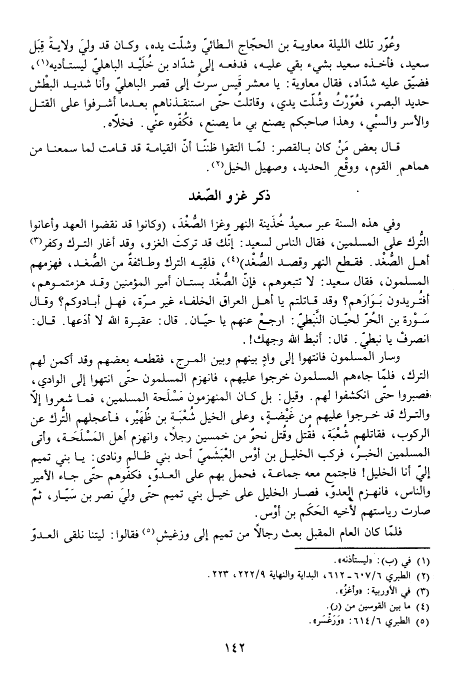 وَفِي هَذِهِ السَّنَةِ عَبَرَ سَعِيدُ خُذَيْنَةَ النَّهْرَ وَغَزَا الصُّغْدَ، (وَكَانُوا قَدْ نَقَضُوا الْعَهْدَ وَأَعَانُوا التُّرْكَ عَلَى الْمُسْلِمِينَ، فَقَالَ النَّاسُ لِسَعِيدٍ: إِنَّكَ قَدْ تَرَكْتَ الْغَزْوَ، وَقَدْ أَغَارَ التُّرْكُ، وَكَفَرَ أَهْلُ الصُّغْدِ. فَقَطَعَ النَّهْرَ، وَقَصَدَ الصُّغْدَ) ، فَلَقِيَهُ التُّرْكُ وَطَائِفَةٌ مِنَ الصُّغْدِ، فَهَزَمَهُمُ الْمُسْلِمُونَ، فَقَالَ سَعِيدٌ: لَا تَتْبَعُوهُمْ، فَإِنَّ الصُّغْدَ بُسْتَانُ أَمِيرِ الْمُؤْمِنِينَ وَقَدْ هَزَمْتُمُوهُمْ، أَفَتُرِيدُونَ بَوَارَهُمْ؟ وَقَدْ قَاتَلْتُمْ يَا أَهْلَ الْعِرَاقِ الْخُلَفَاءَ غَيْرَ مَرَّةٍ، فَهَلْ أَبَادُوكُمْ؟ وَقَالَ سَوْرَةُ بْنُ الْحُرِّ لَحَيَّانَ النَّبَطِيِّ: ارْجِعْ عَنْهُمْ يَا حَيَّانُ. قَالَ: عَقِيرَةُ اللَّهِ لَا أَدَعُهَا. قَالَ: انْصَرِفْ يَا نَبَطِيُّ. قَالَ: أَنَبَطَ اللَّهُ وَجْهَكَ!