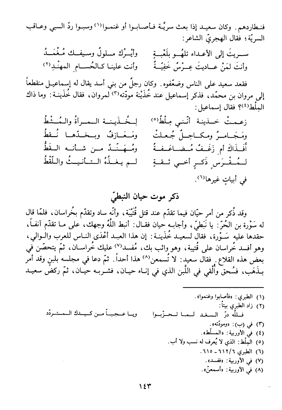 وَقَدْ ذُكِرَ مِنْ أَمْرِ حَيَّانَ فِيمَا تَقَدَّمَ عِنْدَ قَتْلِ قُتَيْبَةَ، وَأَنَّهُ سَادَ وَتَقَدَّمَ بِخُرَاسَانَ، فَلَمَّا قَالَ لَهُ سَوْرَةُ بْنُ الْحُرِّ: يَا نَبَطِيُّ، وَأَجَابَهُ حَيَّانُ، فَقَالَ: أَنَبَطَ اللَّهُ وَجْهَكَ، عَلَى مَا تَقَدَّمَ آنِفًا، حَقَدَهَا عَلَيْهِ سَوْرَةُ، فَقَالَ لِسَعِيدِ خُذَيْنَةَ: إِنَّ هَذَا الْعَبْدَ أَعْدَى النَّاسِ لِلْعَرَبِ وَالْوَالِي، وَهُوَ أَفْسَدَ خُرَاسَانَ عَلَى قُتَيْبَةَ، وَهُوَ وَاثِبٌ بِكَ، مُفْسِدٌ عَلَيْكَ خُرَاسَانَ، ثُمَّ يَتَحَصَّنُ فِي بَعْضِ هَذِهِ الْقِلَاعِ. فَقَالَ سَعِيدٌ: لَا تُسْمِعَنَّ هَذَا أَحَدًا. ثُمَّ دَعَا فِي مَجْلِسِهِ بِلَبَنٍ وَقَدْ أَمَرَ بِذَهَبٍ، فَسُحِقَ وَأُلْقِيَ فِي اللَّبَنِ الَّذِي فِي إِنَاءِ حَيَّانَ، فَشَرِبَهُ حَيَّانُ، ثُمَّ رَكَضَ سَعِيدٌ