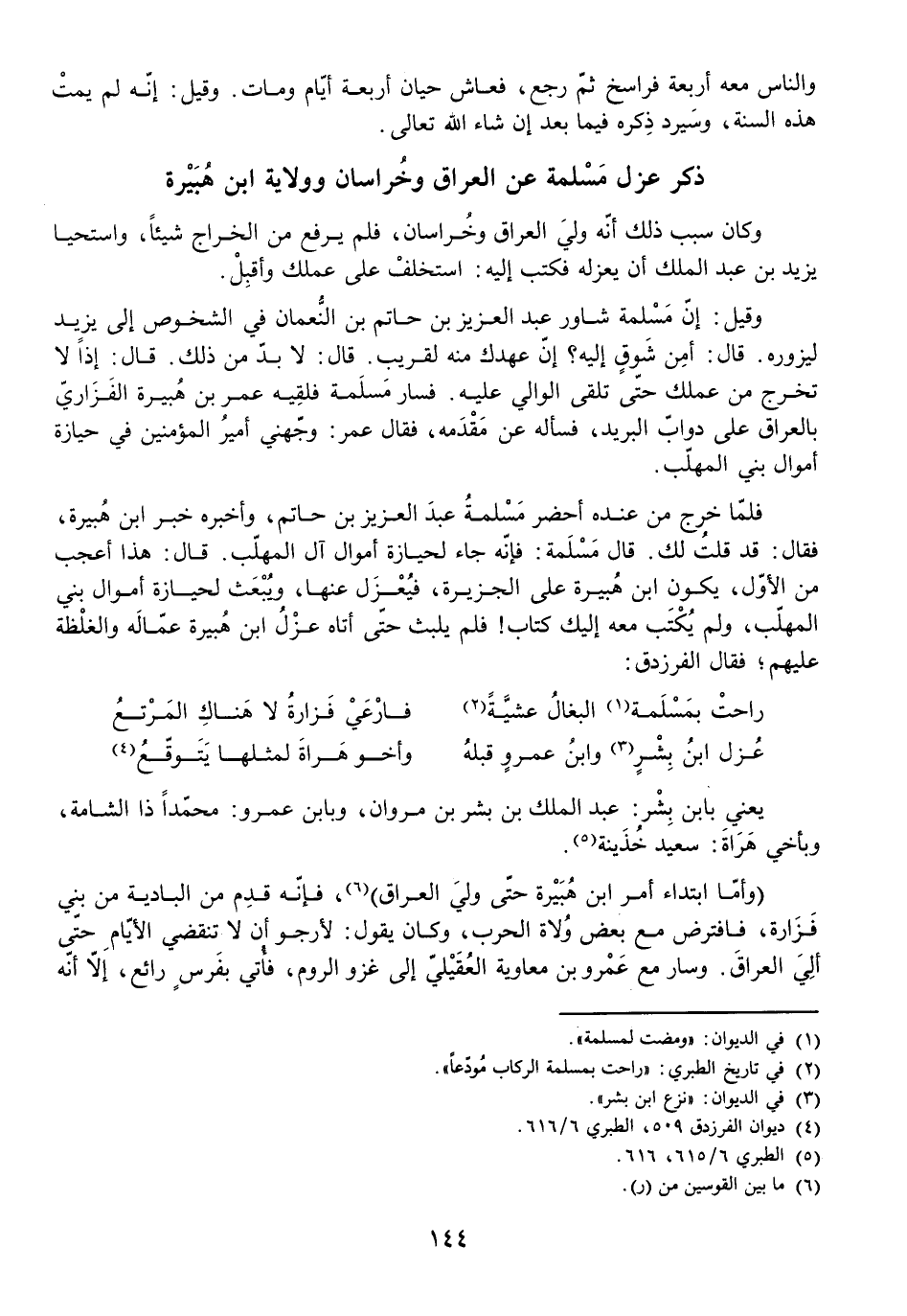 فَلَمَّا خَرَجَ مِنْ عِنْدِهِ أَحْضَرَ مَسْلَمَةُ عَبْدَ الْعَزِيزِ بْنَ حَاتِمٍ، وَأَخْبَرَهُ خَبَرَ ابْنِ هُبَيْرَةَ، فَقَالَ: قَدْ قُلْتُ لَكَ. قَالَ مَسْلَمَةُ: فَإِنَّهُ جَاءَ لِحِيَازَةِ أَمْوَالِ آلِ الْمُهَلَّبِ. قَالَ: هَذَا أَعْجَبُ مِنَ الْأَوَّلِ، يَكُونُ ابْنُ هُبَيْرَةَ عَلَى الْجَزِيرَةِ، فَيُعْزَلُ عَنْهَا، وَيُبْعَثُ لِحِيَازَةِ أَمْوَالِ بَنِي الْمُهَلَّبِ، وَلَمْ يُكْتَبْ مَعَهُ إِلَيْكَ كِتَابٌ! فَلَمْ يَلْبَثْ حَتَّى أَتَاهُ عَزْلُ ابْنِ هُبَيْرَةَ عُمَّالَهُ وَالْغِلْظَةُ عَلَيْهِمْ، فَقَالَ الْفَرَزْدَقُ: